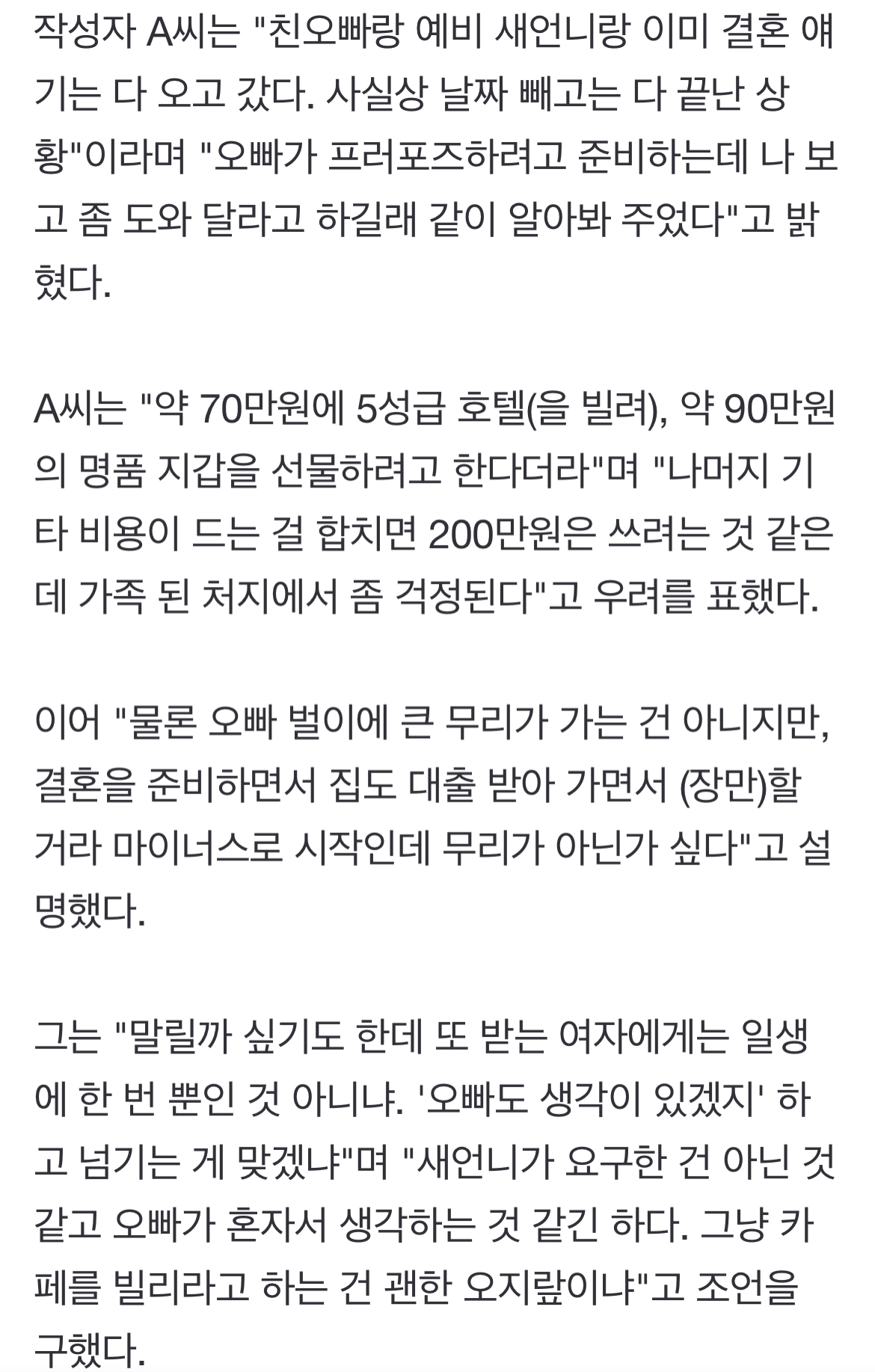 [여시뉴스데스크]"친오빠 5성급 호텔서 '200만원 프러포즈' 계획…이게 맞나요" 작성자JohnPark|작성시간23.05.12|조회수29,796 목록 댓글 155 글자크기 작게가 글자크기 크게가 출처 : https://n.news.naver.com/article/011/0004189640?sid=102"친오빠 5성급 호텔서 '200만원 프러포즈' 계획…이게 맞나요"친오빠가 프로포즈 비용으로 200만원을 지출해 걱정이 된다는 여동생의 사연을 두고 네티즌들의 갑론을박이 거세다. 최근 한 온라인 커뮤니티 게시판에는 친오빠의 프러포즈 비용에 대한 고민n.news.naver.com전문출처로 다음검색 현재 게시글 추가 기능 열기 북마크 공유하기 신고 센터로 신고 댓글 댓글 155 댓글쓰기 답글쓰기 댓글 리스트 작성자(본인닉네 | 작성시간 23.05.13 아 뭔 씨 난 또 물건 빼고 200이라는줄; 뭔ㅋㅋ; 작성자두리두루둥 | 작성시간 23.05.13 지갑으로 프로포즈를..? 작성자한남들뒤져라 | 작성시간 23.05.14 지갑.... ㅎ 작성자치실광공 | 작성시간 23.05.14 대출받은집은 오빠 명의에 대출은 같이 갚을게 뻔하지 않나요.... 작성자나 좆됐는데 딜도로 쓸 사람? | 작성시간 23.05.14 200ㅋㅋ씹성비노 댓글 전체보기