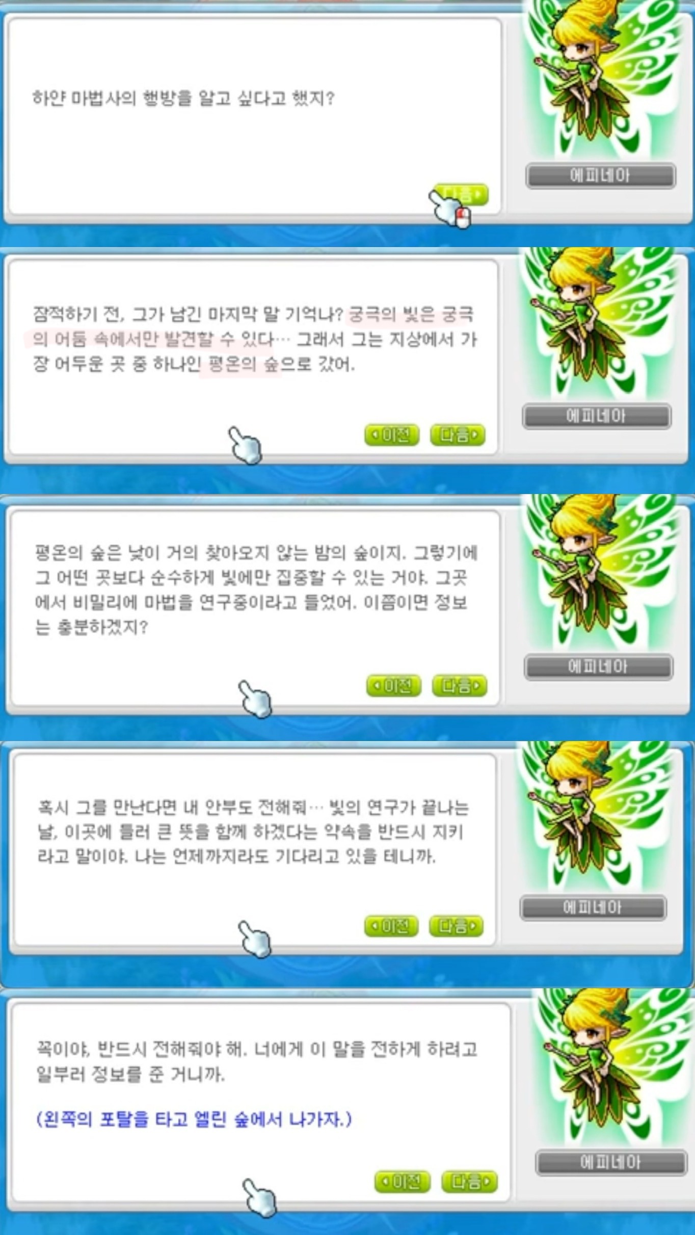 수소문 끝에 엘린 숲에서 페어리의 여왕인 에피네아를 만나 하얀마법사가 있는 장소에 대해 듣게 됨