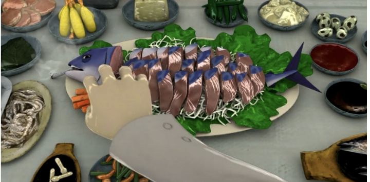 가게 내부에서는 물고기들이 살아있는채로 회쳐져 식탁 위에서 “살…려……줘…, …살……려…줘……, …살…려……줘….”라고 중얼거리는 소리가 들린다.