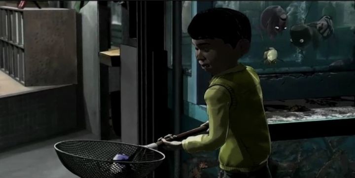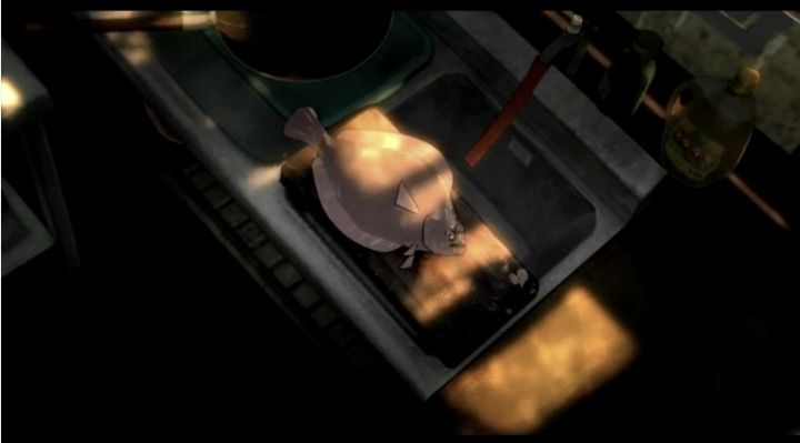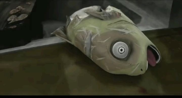 횟집 주인이 올드 넙치를 움켜쥐고 들어올린 순간, 올드넙치는 삼켜두고 있었던 파닥파닥 몸에 박혀있다 빠진 장난감 칼을 뱉어낸다.