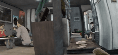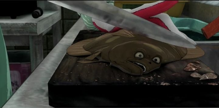 도마 위에 올려진채 싱크대로 버려진 생선 내장과 시체들과 가게 안 모습이 보인다.