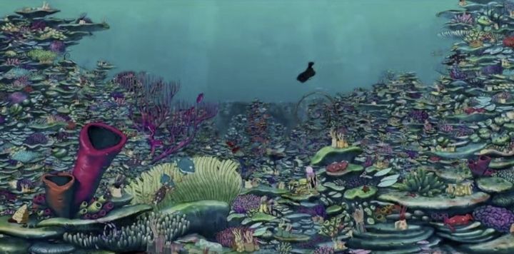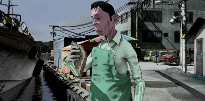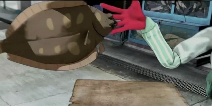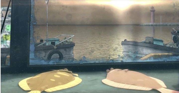 마지막 장면은 인간들의 버린 쓰레기가 쌓여 있는 항구 근처 바닷가에서 깊은 바닷속으로 유유히 헤엄쳐 빠져가는 올드 넙치의 뒷모습.