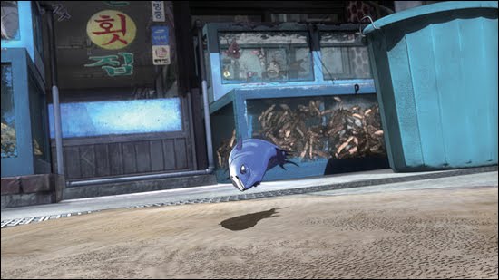 파닥거리며 길건너편 항구를 향해 가지만 주인에게 들키고 실패하여 다시 수족관 안으로 들어오게 된다.