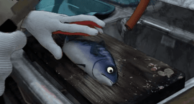파닥파닥은 그 안에서 다른 고등어가 횟집 주인에 의해 산 채로 회쳐지는 모습을 목격하고 충격에 빠져 날뛴다.