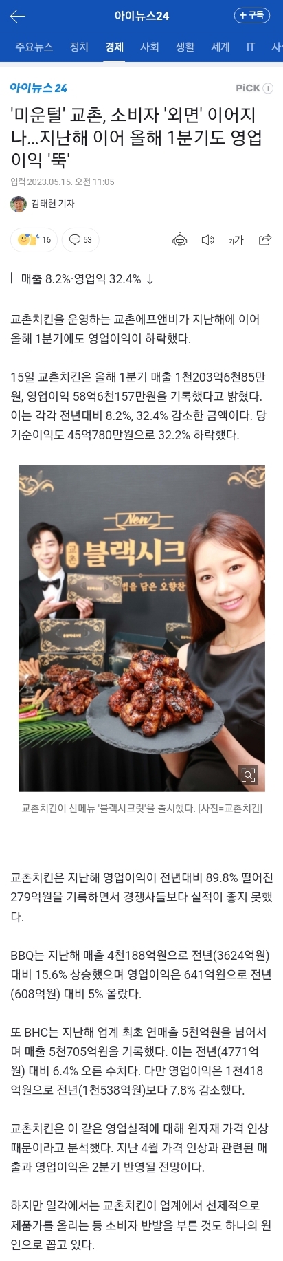 [여시뉴스데스크]미운털' 교촌, 소비자 '외면' 이어지나…지난해 이어 올해 1분기도 영업이익 '뚝' 작성자트트치치|작성시간23.05.15|조회수16,374 목록 댓글 164 글자크기 작게가 글자크기 크게가 출처 : https://n.news.naver.com/article/031/0000746402?sid=101'미운털' 교촌, 소비자 '외면' 이어지나…지난해 이어 올해 1분기도 영업이익 '뚝'교촌치킨을 운영하는 교촌에프앤비가 지난해에 이어 올해 1분기에도 영업이익이 하락했다. 15일 교촌치킨은 올해 1분기 매출 1천203억6천85만원, 영업이익 58억6천157만원을 기록했다고 밝혔다. 이n.news.naver.com 다음검색 현재 게시글 추가 기능 열기 북마크 공유하기 신고 센터로 신고 댓글 댓글 164 댓글쓰기 답글쓰기 댓글 리스트 작성자하바바하 | 작성시간 23.05.16 교촌이랑 현대카드 둘 다 절대로 소비안해~~^^ 작성자쪽빠리척결 | 작성시간 23.05.17 쭉쭉 더 떨어져라~~ 작성자로제불닭납작당면존맛 | 작성시간 23.05.17 꼴좋다 작성자김밥싸줘 | 작성시간 23.05.18 교촌 진짜 안먹은지 진짜 개오래됨 작성자건강건강둥 | 작성시간 23.05.18 그러게 요즘 맛있는 치킨 너무 많아짐 댓글 전체보기