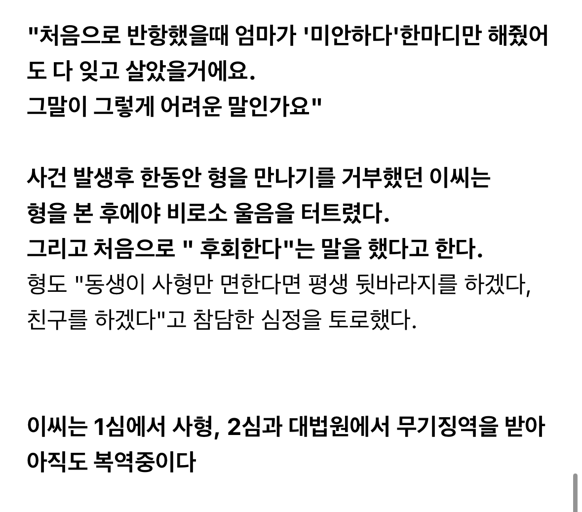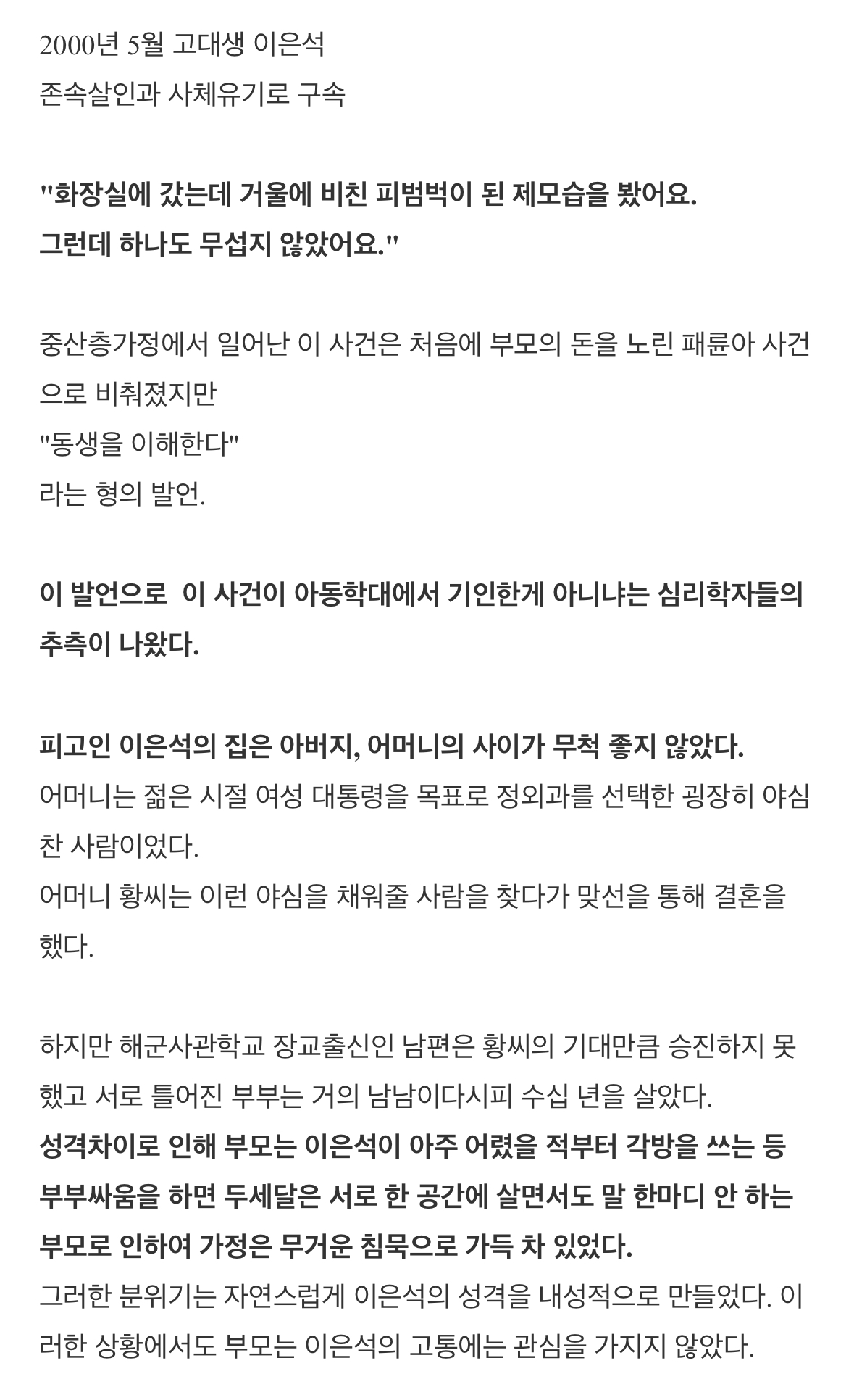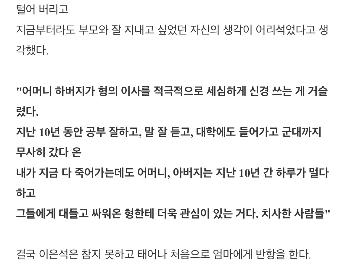 [흥미돋]부모를 살해하고도 동정받은 사건 (이은석 사건) 작성자키이새야... 나애키이새야|작성시간23.05.24|조회수9,428 목록 댓글 27 글자크기 작게가 글자크기 크게가 출처 : 여성시대 키이새야... 나애키이새야 다음검색 현재 게시글 추가 기능 열기 북마크 공유하기 신고 센터로 신고 댓글 댓글 27 댓글쓰기 답글쓰기 댓글 리스트 작성자윙칙힌 | 작성시간 23.05.24 이건 부모가 자식을 인격 살인한 사건이지.. 작성자울고싶을땐웃자 | 작성시간 23.05.24 이건 진짜.. 삭제된 댓글입니다. 답댓글 작성자세른이가될거야 | 작성시간 23.05.24 와 진짜야.....? 너무 맘아프다 답댓글 작성자토트넘훗스퍼 | 작성시간 23.09.06 헐ㅠ 댓글 전체보기