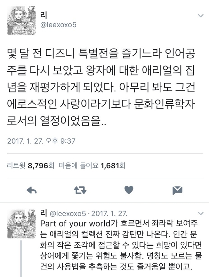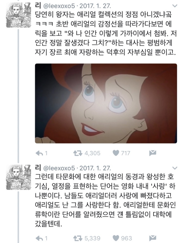 작성자휠롤러 작성시간 23.05.25 바다에 빠진게 공주였다면 좋은 친구가 됐을텐데 남자라서 그 모든 호기심과 열정이 사랑이라고 정의된게 아쉬움 공주구해주고 공주가 바로 알아봐서 친구되고 같이 다시 목소리찾는여정을 거친다음 공주는 왕되고 가끔 바다로가서 바닷속대학 교수된 인어공주랑 만나는 그런엔딩이었으면 좋았을것을