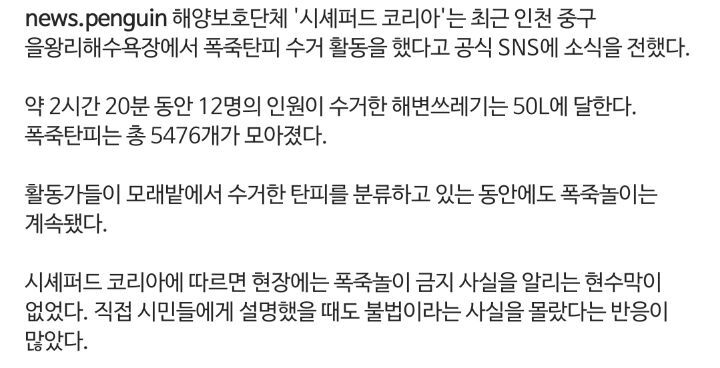 작성자AVEC 작성자 본인 여부 작성자 작성시간 23.05.27 뾰족해서 해변 찾는 관광객에게도 위험하고 미세플라스틱이 되어 환경오염까지 유발하는 폭죽탄피 물론 불법이기도 함
