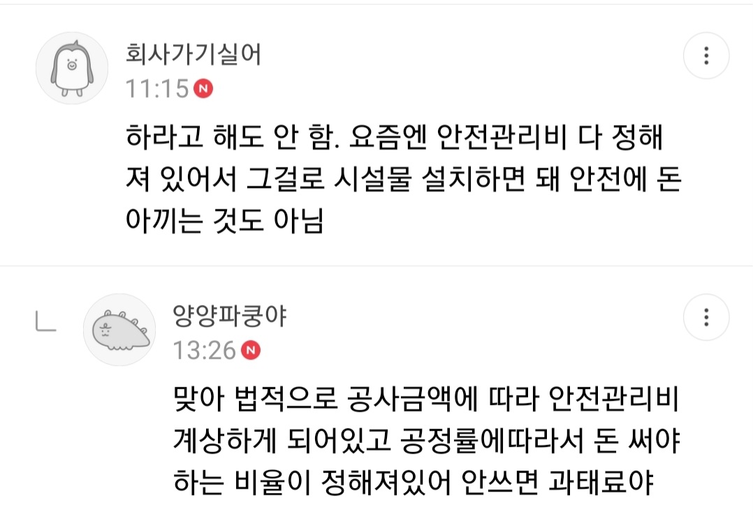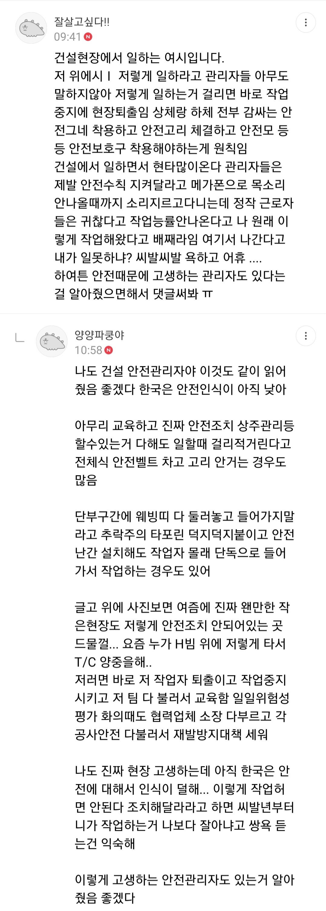 작성자이성애강요를멈춰주세요 작성시간 23.05.27 맞아 산업안전 강사가 현장에서 관리자들이 아무리 안전교육, 지도해도 노동자들이 귀찮다고 안 한다 했음.. 사고나면 관리자 책임인데