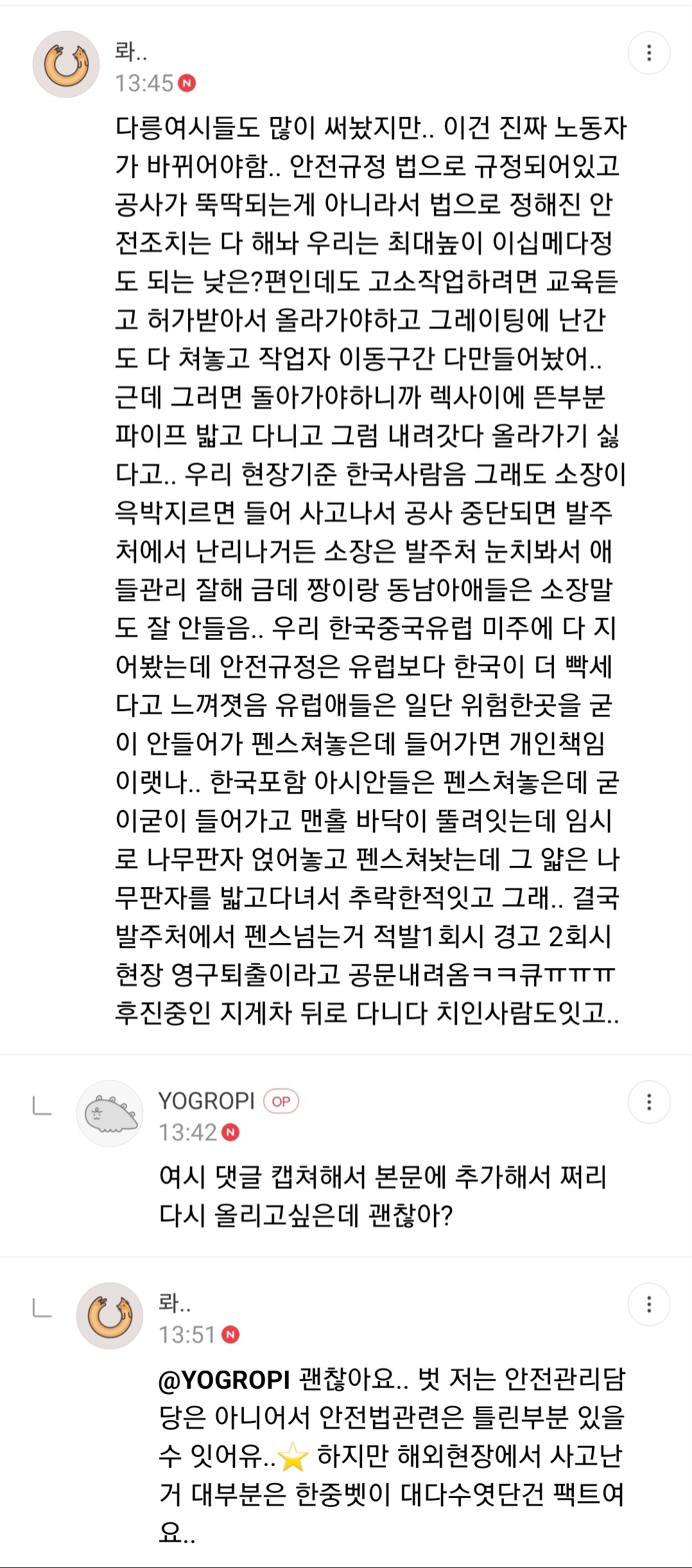 작성자루루라란 작성시간 23.05.27 근데진짜 아직도.. 안전수칙 어기지 않는곳 찾기가 하늘의 별따기아녀?? 그거 지키면서 어떻게 시간안에 작업하냐 << 이 말 진짜 수도없이 들어본듯ㅋㅋㅋ 건설업계는 아니지만..