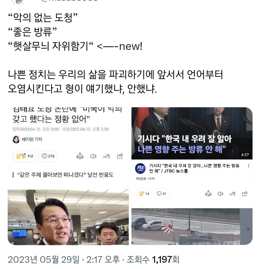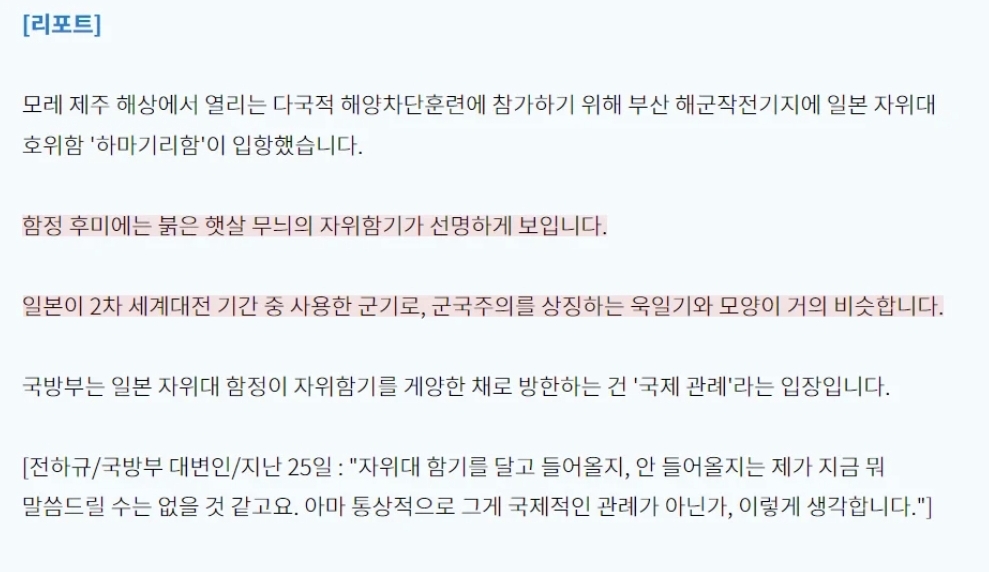 작성자후루룩커피 작성시간 23.05.30 밑에 kbs 짤 보니까 '햇살무늬의 자위함기가 선명히 보인다, 욱일기와 모양이 거의 비슷하다' 라고 적혀있는데 욱일기랑 저게 다른거야?? 전범기로 보이는데 왜 욱일기가 아니라 비슷한거라고 표현하지??