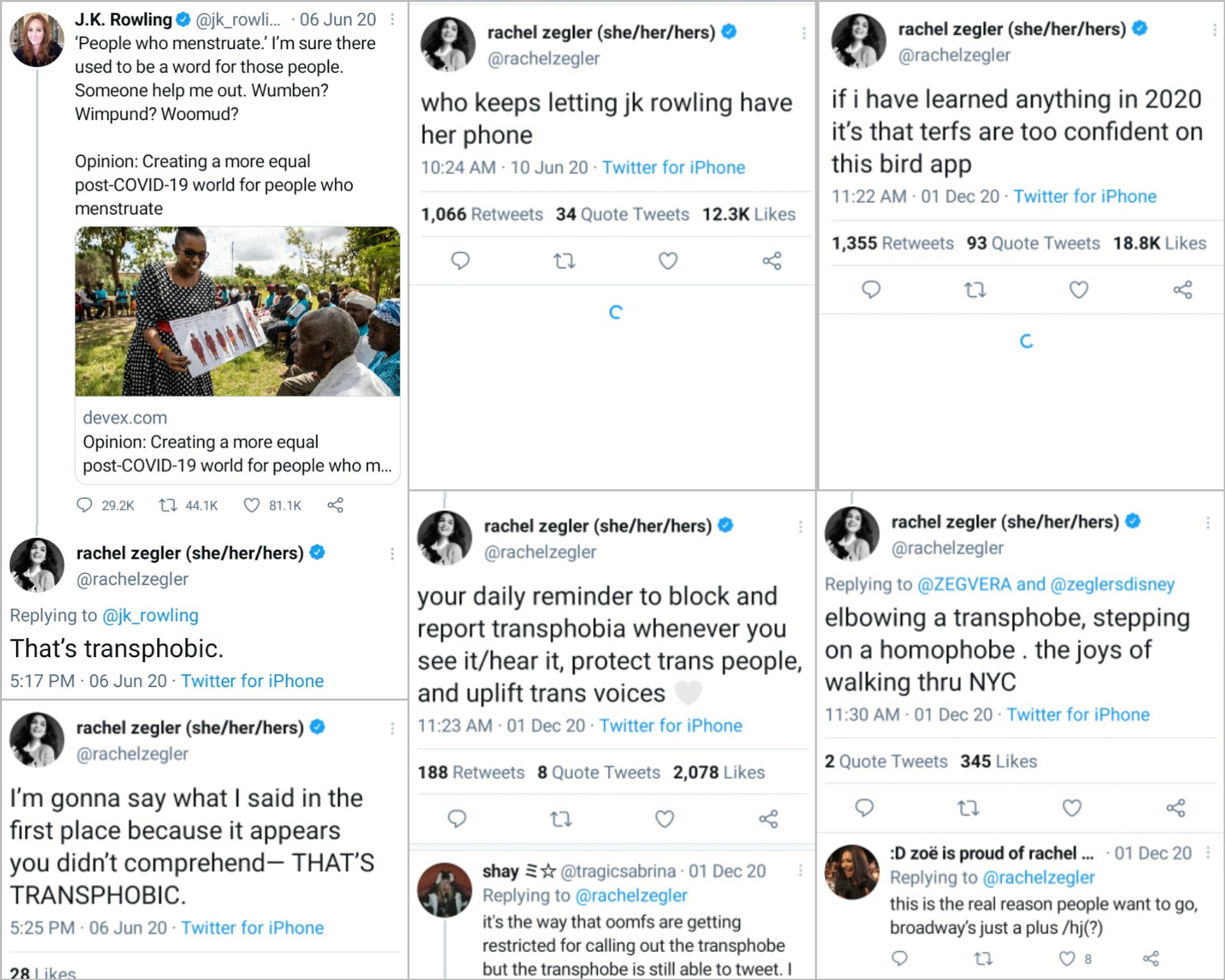 조앤롤링이 여자를 '생리하는 인간'이라고 지칭한 기사를 비판하며 '생리하는 인간' 말고 다른 단어가 있지 않냐는 트윗에 롤링을 트랜스젠더 혐오주의자라며 몰아감