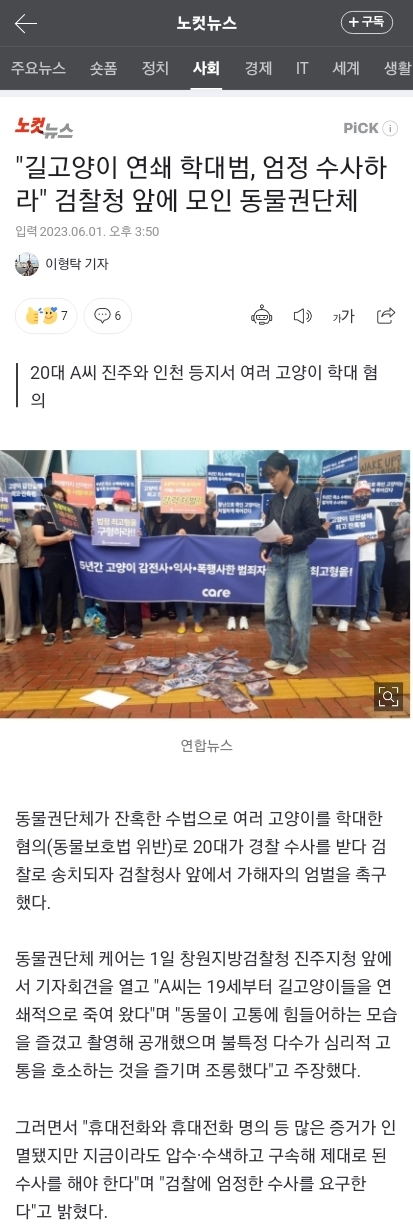 [여시뉴스데스크]"길고양이 연쇄 학대범, 엄정 수사하라" 검찰청 앞에 모인 동물권단체 작성자트트치치|작성시간23.06.01|조회수603 목록 댓글 14 글자크기 작게가 글자크기 크게가 출처 : https://n.news.naver.com/article/079/0003776171?sid=102"길고양이 연쇄 학대범, 엄정 수사하라" 검찰청 앞에 모인 동물권단체동물권단체가 잔혹한 수법으로 여러 고양이를 학대한 혐의(동물보호법 위반)로 20대가 경찰 수사를 받다 검찰로 송치되자 검찰청사 앞에서 가해자의 엄벌을 촉구했다. 동물권단체 케어는 1일 창n.news.naver.com 다음검색 현재 게시글 추가 기능 열기 북마크 공유하기 신고 센터로 신고 댓글 댓글 14 댓글쓰기 답글쓰기 댓글 리스트 작성자김미연(건성) | 작성시간 23.06.01 ㅡㅡ당장 처벌해라!!!수사해!!!! 작성자김미연(건성) | 작성시간 23.06.01 신상공개해라!!!!!!!! 작성자한남과 도태는 동의어 | 작성시간 23.06.01 수사 제대로 좀 해!!!!!!!! 작성자곤이짱 | 작성시간 23.06.01 부모도 공무원이래 인스타에신상 다있음 작성자efgjj | 작성시간 23.06.01 제발 댓글 전체보기