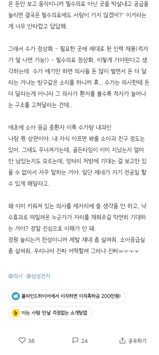 국민이 내는 세금이 쓰이는 용도처가, 저 의사가 말하는 저런 필수의료에 좀더 집중됐음 좋겠어 ㅠㅠ -