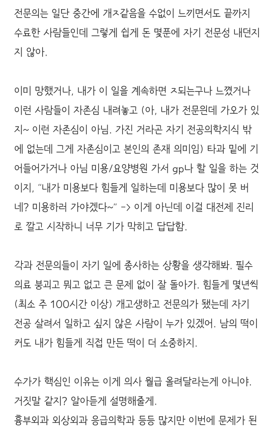 수가 문제도, 의사가 환자를 볼수록 적자가 늘어나는 구조 자체를 고치라는것도 너무 이해가 감