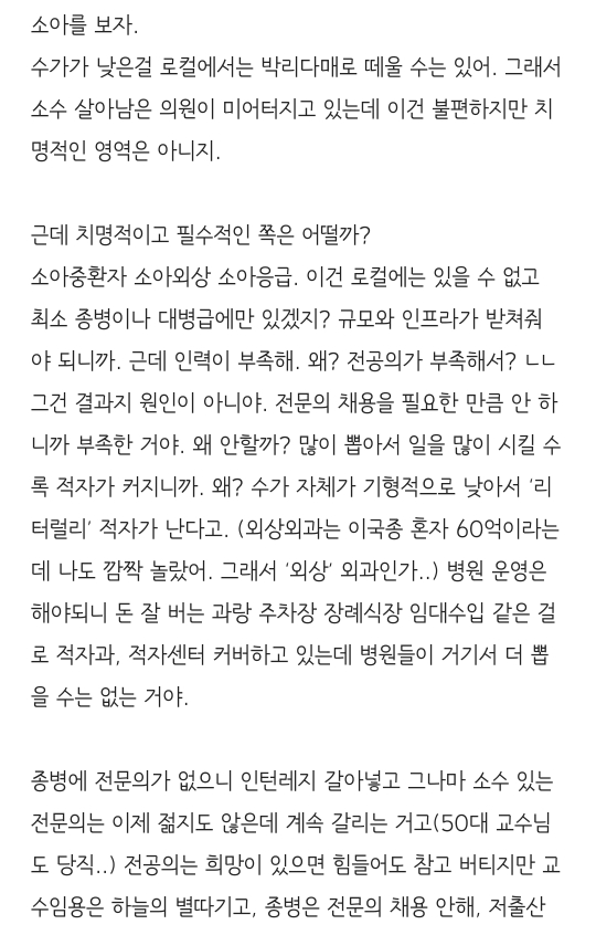 일단 우리는 가장 많이 보는 환자를 기준으로 수가를 책정해 예를 들면 성인환자 한 명이 낫기 위해 전문의가 서로 다른 분야에서 하나씩 두 명이 10시간 붙어야 하고 간호사는 8시간씩 4명이 붙어야 하고 A라는 약제는 100ml가 필요하고...등등 그럼 소아 환자는 어떻게 할까? 아마 비슷할거야 인력은 비슷하게 쳐주고, 약은 오! 소아니까 반만 써라~ 이렇게 근데 문제는 소아는 어른보다 많은 도움을 필요로 하잖아? 그러니까 인력이 더 공을 들여야 하고, 약도 제약회사에서 100ml를 기준으로 만들지 50ml를 기준으로 만들지 않으니까 애기 하나를 치료하기 위해 결국 100ml 병을 뜯어야 해 즉, 최종적으로 소아 하나를 보기 위해 성인과 똑같거나 더 많은 비용이 들어가는 거지...근데 나라에서는 비용을 더 책정해주지는 않는 거야 왜냐면 이미 건보재정이 여유롭지 못하고, 특정 어떤 분야에만 돈을 더 주면 다른 분야들도 반발하니까...이렇게 되면 병원은 적자가 날 수밖에 없어 그래서 병원은 인력이 많이 필요하거나 비싼 장비가 필요한 소아나 흉부외과를 줄이게 되는 거지 -