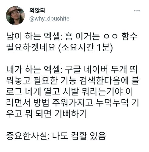 [기타]남이하는 엑셀 vs 내가 하는 엑셀 작성자mium!!|작성시간23.06.02|조회수52,991 목록 댓글 22 글자크기 작게가 글자크기 크게가 출처 : 여성시대 (mium!!)출처-https://twitter.com/why_doushite/status/1377854573637816320?s=20 다음검색 현재 게시글 추가 기능 열기 북마크 공유하기 신고 센터로 신고 댓글 댓글 22 댓글쓰기 답글쓰기 댓글 리스트 작성자뮹냐리 | 작성시간 23.06.02 그리고 다음에 업데이트하면 수식 오류나서 다시찾기 작성자홍 지 수 | 작성시간 23.06.02 #VALUE! #REF! 답댓글 작성자토니 스타크 | 작성시간 23.06.02 ㅋㅋㅋㅋㅋㅋㅋㅋㅋㅋㅋㅋㅋㅋㅋㅋㅋㅋㅋㅋㅋㅋㅋㅋㅋㅋㅋㅋㅋㅋㅋㅋㅋ 답댓글 작성자마리아다카스코스 | 작성시간 23.06.02 ㅋㅋㅋㅋㅋㅋㅋㅋㅋㅋㅋㅋㅋㅋㅋㅋㅋㅋㅋㅋ 답댓글 작성자Ciruulle | 작성시간 23.06.02 ㅋㅋㅋㅋㅌㅌㅌㅌㅌㅋㅋㅋ 댓글 전체보기