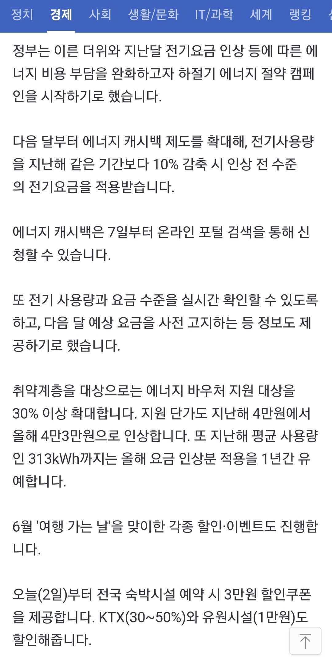 다음 달부터 에너지 캐시백 제도를 확대해, 전기사용량을 지난해 같은 기간보다 10% 감축 시 인상 전 수준의 전기요금을 적용받습니다.