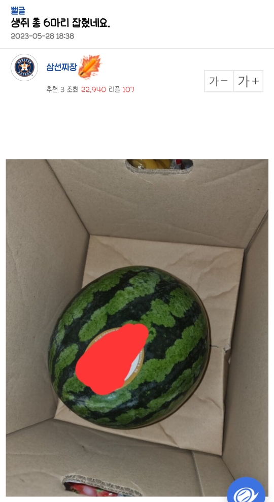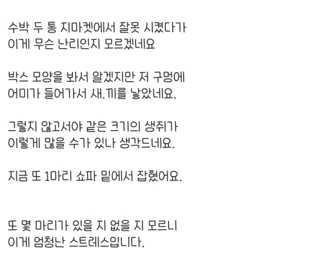 배송받고 박스를 한참 뒤에 열어봤대 그래서 저 구멍으로 빠져나오지 않았나 하는 건데 박스에 배설물 같은 건 없었고 추측치고는 글을 되게 개봉하면서 쥐를 본듯이 쓴거같아이미지 확대