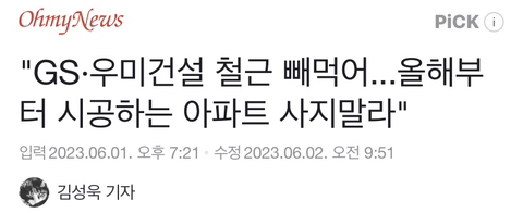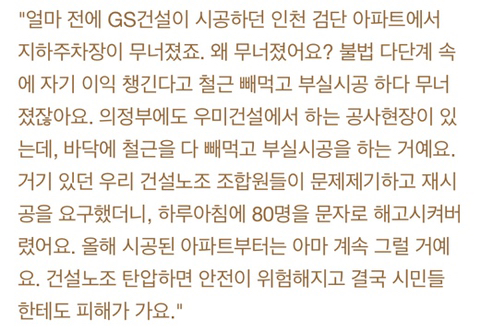 [여시뉴스데스크]"GS·우미건설 철근 빼먹어...올해부터 시공하는 아파트 사지말라" 작성자소리앙|작성시간23.06.03|조회수5,858 목록 댓글 24 글자크기 작게가 글자크기 크게가 출처 : https://naver.me/GpeiVHXq"GS·우미건설 철근 빼먹어...올해부터 시공하는 아파트 사지말라"국회 토론회에서 부실 공사 사례 공개... "건설노조 사라지면 시민이 피해" ▲ 처참한 붕괴 사고 현장 지난 5월 2일 오후 인천시 서구 검단신도시 모 아파트 신축 공사장에서 국토교통부 사고조사n.news.naver.com전문출처 다음검색 현재 게시글 추가 기능 열기 북마크 공유하기 신고 센터로 신고 댓글 댓글 24 댓글쓰기 답글쓰기 댓글 리스트 작성자감귤아기억할게 | 작성시간 23.06.03 어..? 나 검단에 임대 계약금 넣엇은데.. 우미................... 작성자사이온탱킹 | 작성시간 23.06.03 헐 작성자어떡헤요 | 작성시간 23.06.03 2017년 이후에 지어진 아파트 들어가지말라더니 와… 작성자그웬 스파이디 | 작성시간 23.06.03 내 친구 몇년 전에 청약 당첨된 아파트 검단 우미 같던데;; 작성자LoveAlwaysWins | 작성시간 23.06.03 나 곧 입주인데 아..ㅋㅋㅋ ㅅㅂ 댓글 전체보기