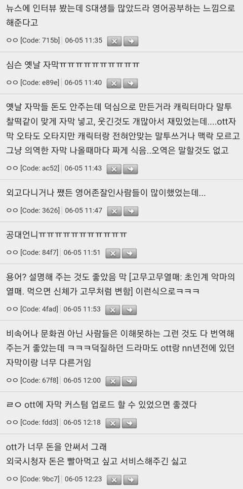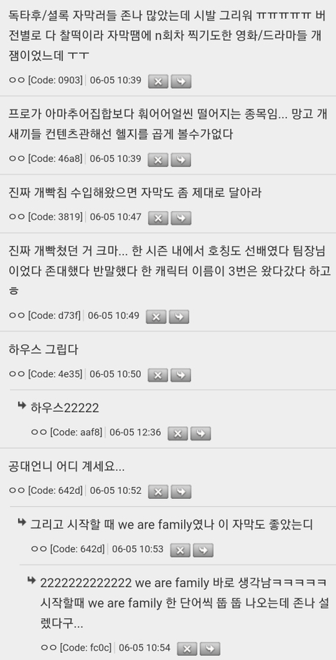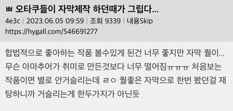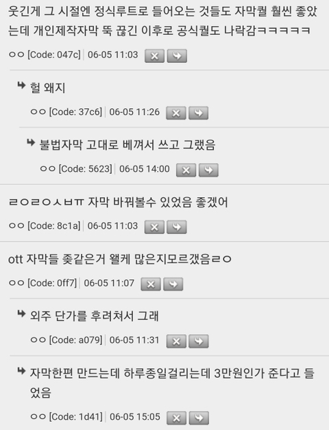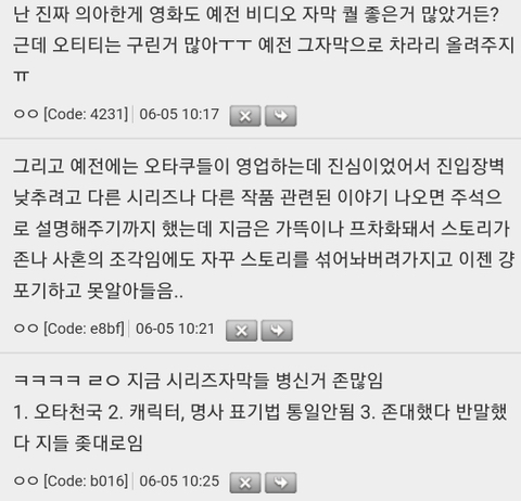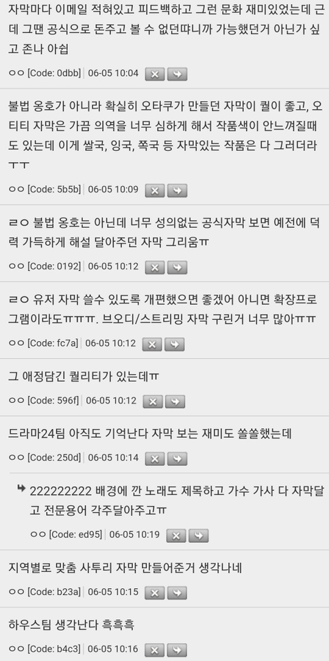 [흥미돋]오타쿠들이 자막제작 하던때가 그립다... 작성자마지막싚새|작성시간23.06.06|조회수32,842 목록 댓글 147 글자크기 작게가 글자크기 크게가 출처 : https://hygall.com/546691277 다음검색 현재 게시글 추가 기능 열기 북마크 공유하기 신고 센터로 신고 댓글 댓글 147 댓글쓰기 답글쓰기 댓글 리스트 작성자yourelosingme | 작성시간 23.06.07 공대언니 잘 지내시나요... 작성자에베베베베베베베 | 작성시간 23.06.07 ㅋㅋㅋㅋㅋㅋㅋ 자막팀할때 재밌었어.... 매주 시간맞춰서... 작성자세노세요? | 작성시간 23.06.07 와 공대언니 익숙한데 작성자깔라만칵씨 | 작성시간 23.06.07 요새는 진짜 말도안되는 양을 주나? 작성자곰말랭이 | 작성시간 23.06.11 와 맞아 waf 댓글 전체보기
