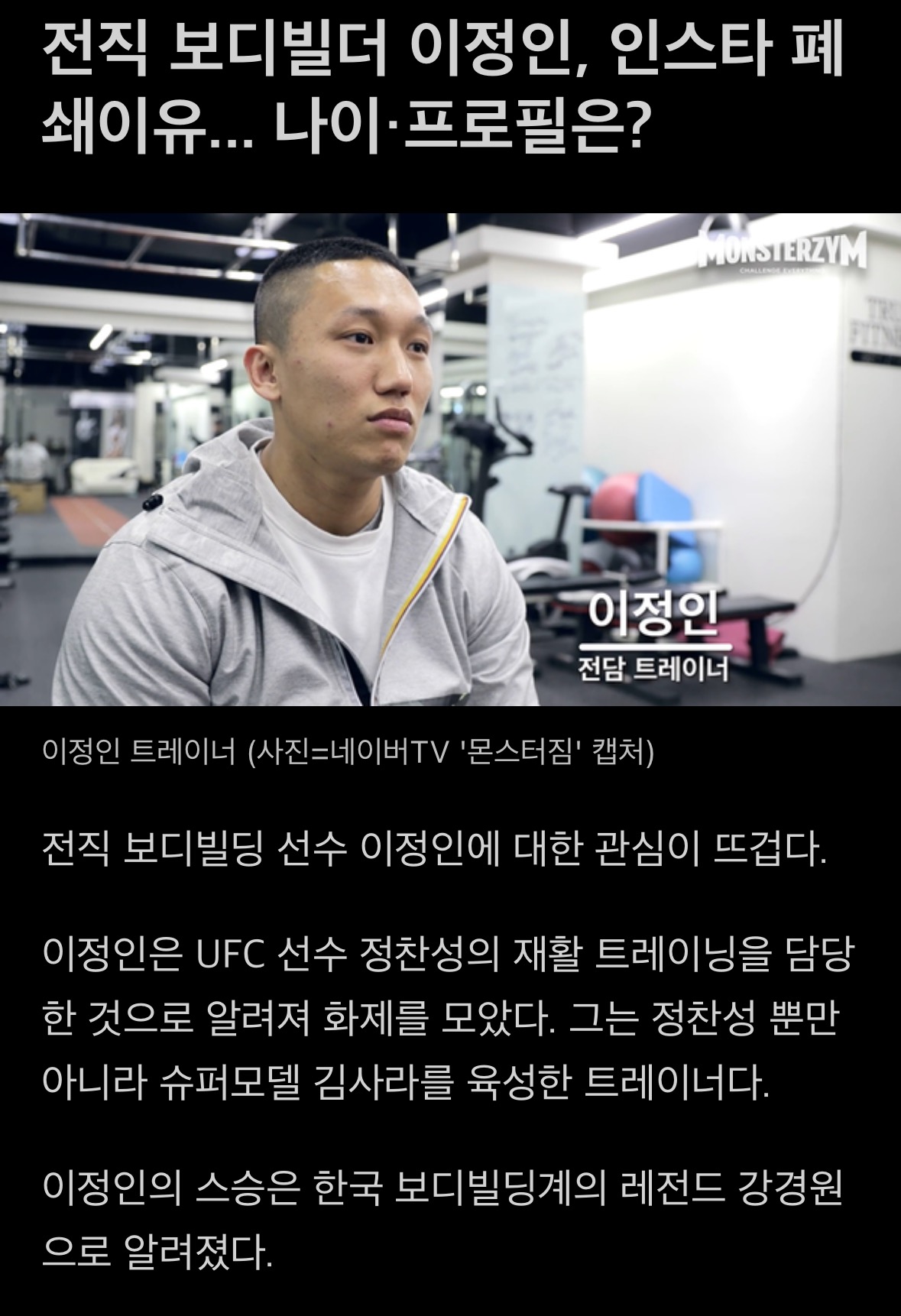 [스크랩] [여시뉴스데스크]전직 보디빌더 이정인, 인스타 폐쇄이유... 나이·프로필은? 작성자카이지|작성시간23.06.06|조회수29,202 목록 댓글 53 글자크기 작게가 글자크기 크게가 출처 : https://www.gukjenews.com/news/articleView.html?idxno=2733458전직 보디빌더 이정인, 인스타 폐쇄이유... 나이·프로필은? - 국제뉴스전직 보디빌딩 선수 이정인에 대한 관심이 뜨겁다.이정인은 UFC 선수 정찬성의 재활 트레이닝을 담당한 것으로 알려져 화제를 모았다. 그는 정찬성 뿐만 아니라 슈퍼모델 김사라를 육성한 트레www.gukjenews.com쩌리에 제목으로 보디빌더 검색 다음검색 스크랩 원문 : *여성시대* 차분한 20대들의 알흠다운 공간 현재 게시글 추가 기능 열기 북마크 공유하기 신고 센터로 신고 댓글 댓글 53 댓글쓰기 답글쓰기 댓글 리스트 삭제된 댓글입니다. 답댓글 작성자쨰니짱 | 작성시간 23.07.08 구르기마스터 그니까 이거 영상 박제되서 지애비가 저런거 꼭 봣으면.. 작성자체체라 | 작성시간 23.07.08 니네 애 태어나면 니 애비 폭행남이라고 알려라 당당하면 작성자모자세탁틀 | 작성시간 23.07.09 ㅎㅎㅎ 작성자냠냐미ㅎ | 작성시간 23.07.10 너무.. 너무화나 진짜 댓글 전체보기