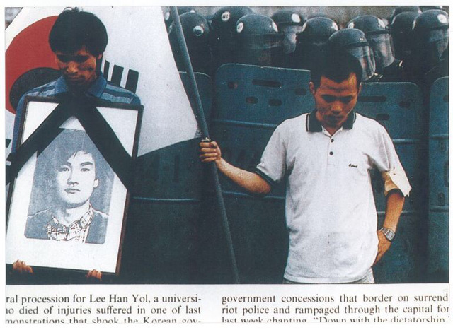 참고로 이한열 열사는 전두환 정권을 무너뜨리는데 결정적 역할을 했던 1987년 6월 민주항쟁의 기폭제가 되셨던분.