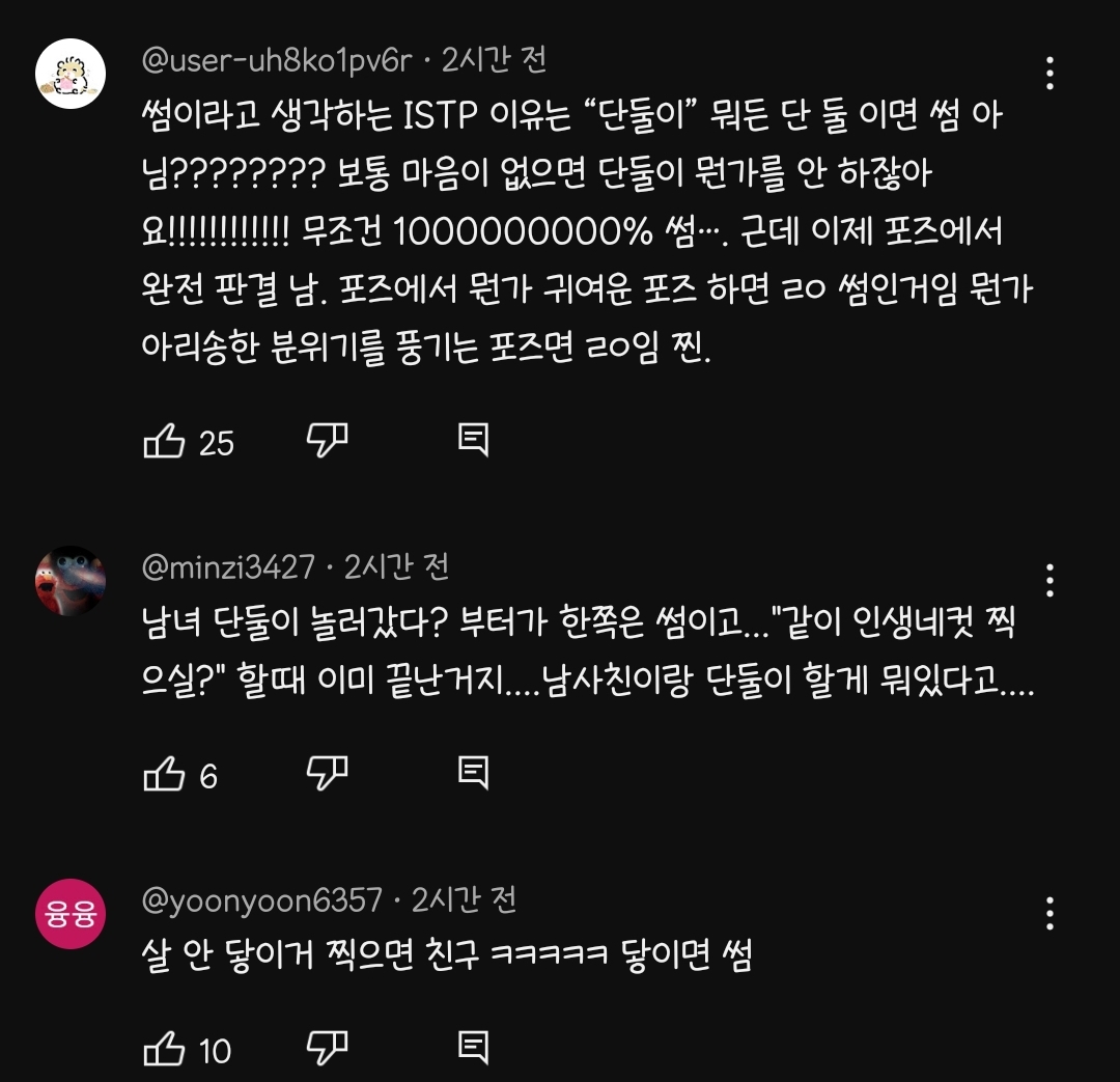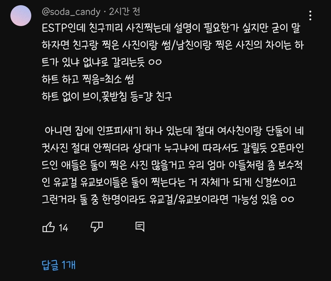 [흥미돋]이성과 단둘이 인생네컷 썸이다 vs 아니다 작성자따봉우주야|작성시간23.06.12|조회수42,513 목록 댓글 381 글자크기 작게가 글자크기 크게가 출처 : 여성시대 따봉우주야(이성애자 한정...!)각각 mbti도 알려줘~~~이거 보고 궁금해서 글팜 다음검색 현재 게시글 추가 기능 열기 북마크 공유하기 신고 센터로 신고 댓글 댓글 381 댓글쓰기 답글쓰기 댓글 리스트 작성자뻐꿈뻐꿈 | 작성시간 23.06.13 esfp 썸이다단순 친구?? 난 절대 못해 작성자pinguu | 작성시간 23.06.13 엔팁 썸이요..? 작성자6월만기다리는여성 | 작성시간 23.06.13 esfj 걍친구.. 작성자지푸라기 | 작성시간 23.06.13 infp 친구! 작성자쌉졸귀 | 작성시간 23.06.14 esfp 굳이 남사친이랑 둘이찍은 사진 소장하고싶진않아서 썸 댓글 전체보기