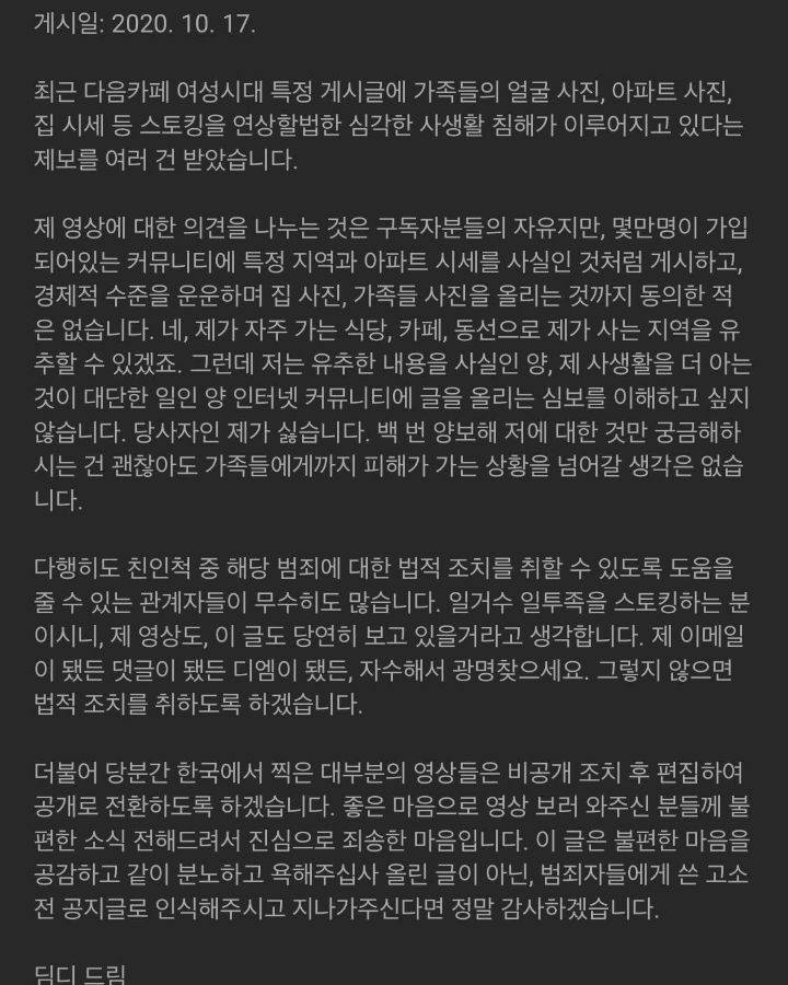 2020년도, 딤디 가족, 집 위치 등등 신상 털어서 유튜브 커뮤니티에 박제됨