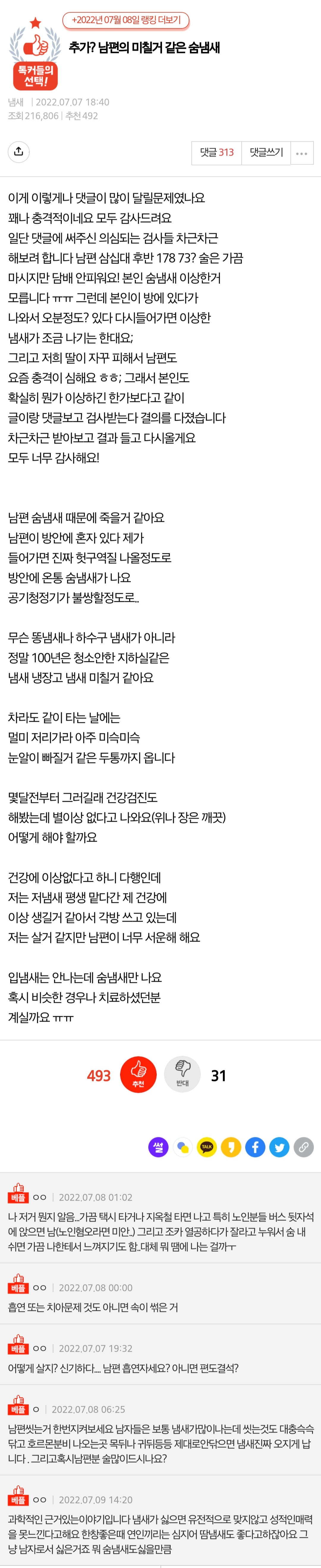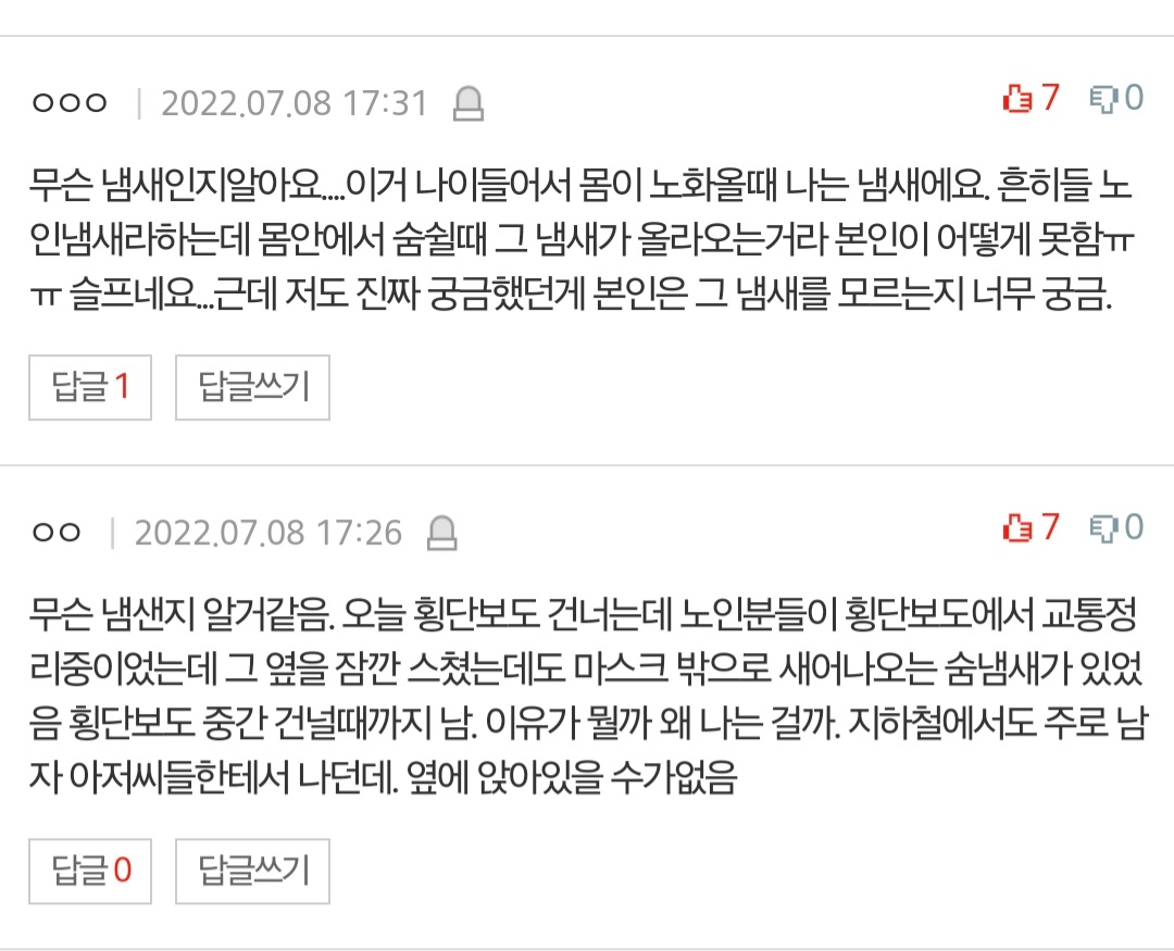 나 진짜 이거.. 울앱도 그렇고 대부분 남자들 중년분들 대중교통에서 스치거나 대화할일 있을때 죄송하지만 입냄새도 아니고 이런 속에서부터 올라오는 퀴퀴하고 역한 숨냄새 때문에 자동으로 헛구역질 올라오려던적 많음...