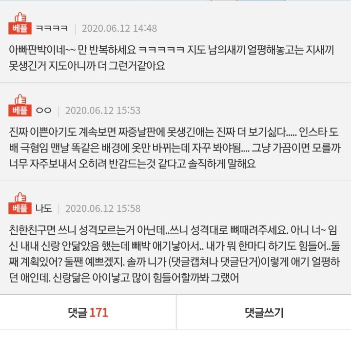작성자너였다면 작성시간 23.06.16 아 나 지금 질려버랴서 지금 연어왔는데 기가막히데 이런글이 있네 아 돌아버려 ㅋㅋㅋ이쁘면 모르겠는데 진짜 지눈에만 귀여운거야 ㅋㅋㅋㅋㅋㅋ지눈에도 이쁜거 아님 ㅜ귀여운거 지새끼라 ㅋㅋㅋ아 그럼 내눈엔 어떻겠냐고 ㅡㅡㅋ