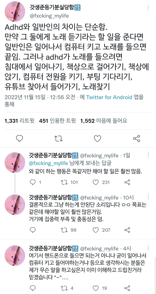 행동을 하기가 버겁다는거에 굉장히 공감이 가는 글이었는데 여시는 이것 저것 많은 루틴을 소화할 수 있는 걸 오히랴 adhd냐고 물어보니까 너무 뚱딴지 같은 질문 같았어 -