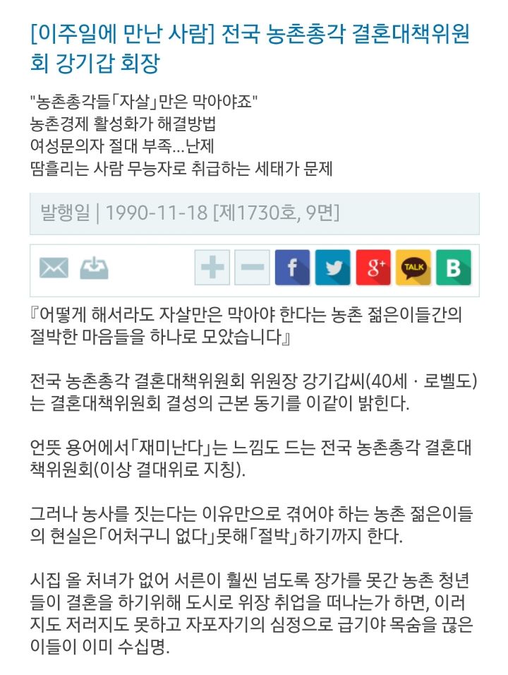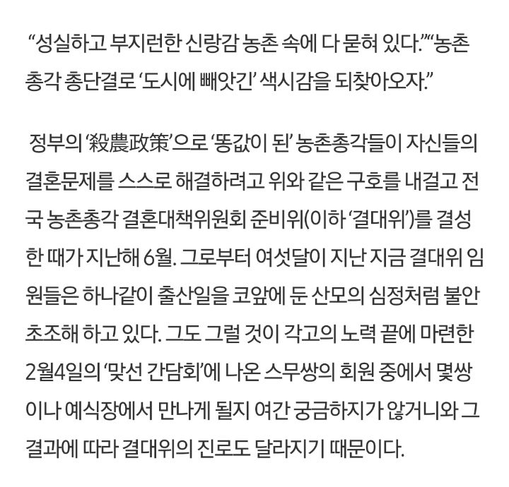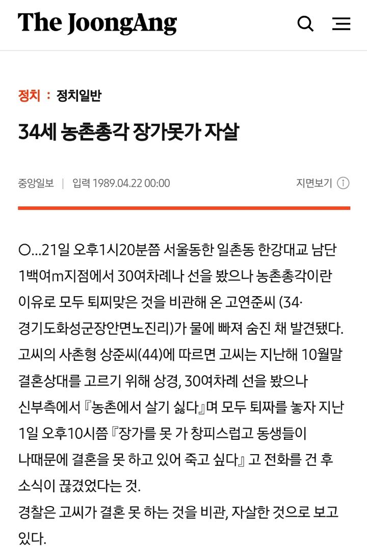 농촌 노총각들 죽지말라고 외국처녀 수입해오자 도시에 뺏긴 처녀들 데려오자 육갑잔치 떨면서 위원회(......) 까지 만들어 단체 미팅도 시켜주고 지금의 매매혼을 활성화시킴