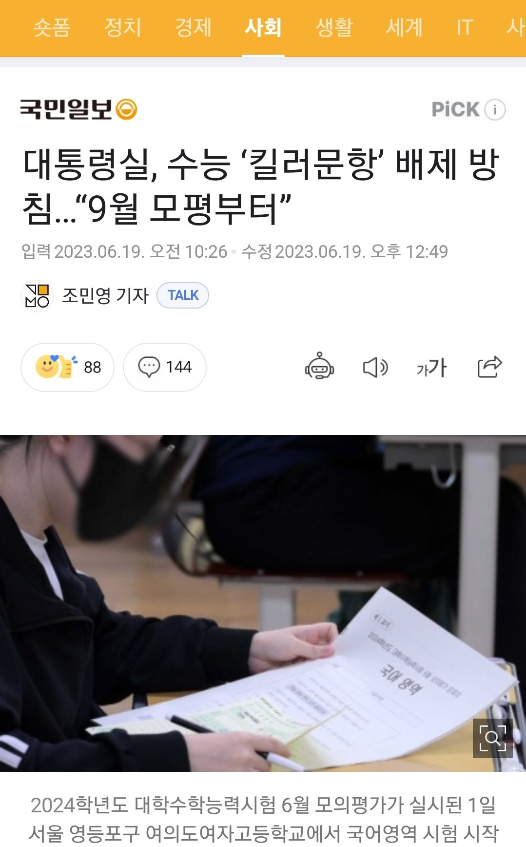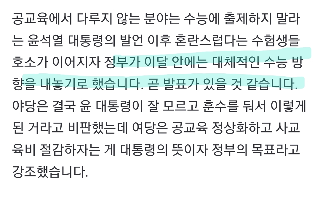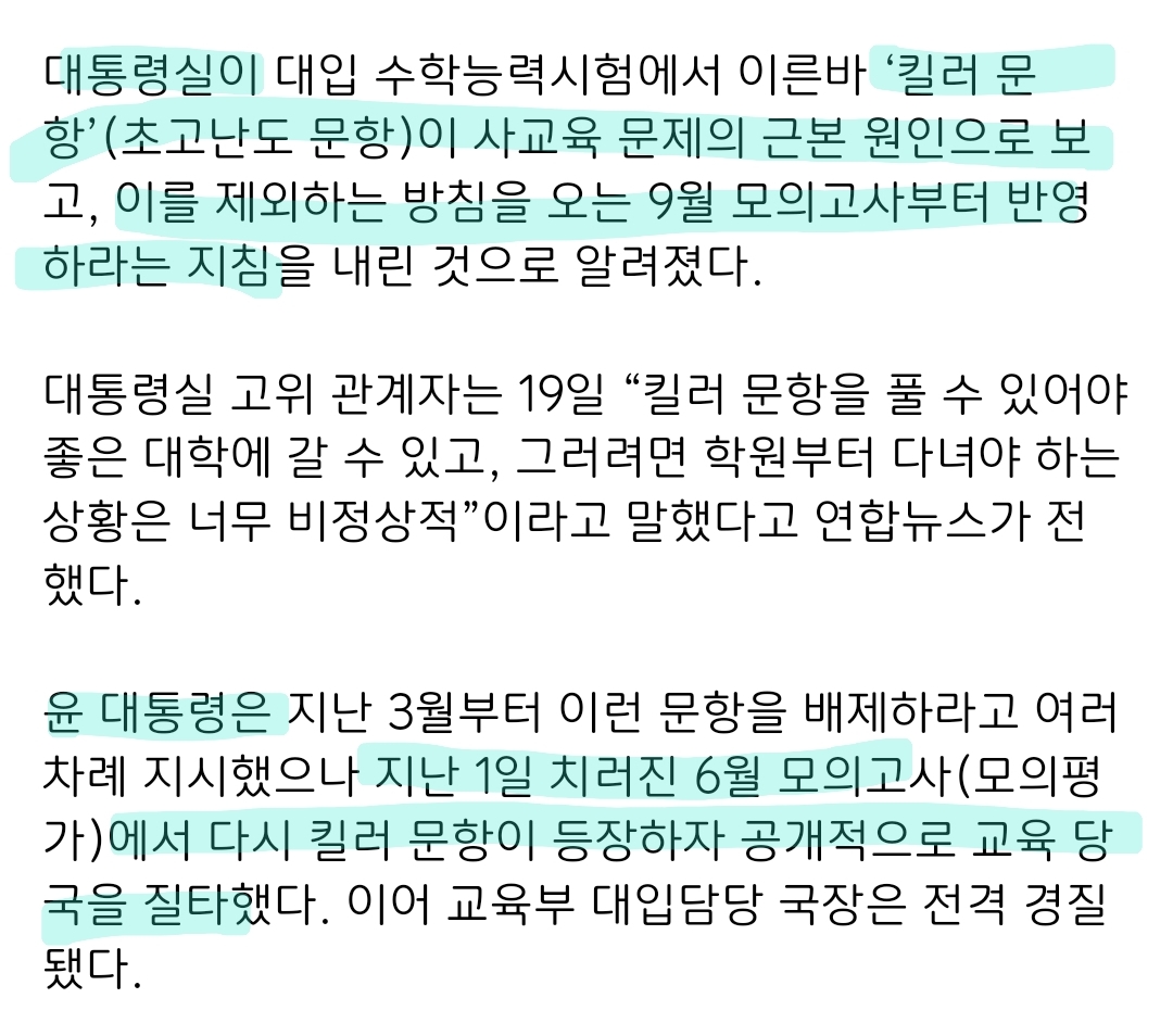 [흥미돋]현재 수능 5개월 앞두고 수능 지침 변경돼서 대혼란..jpg 작성자아마레티|작성시간23.06.19|조회수8,708 목록 댓글 36 글자크기 작게가 글자크기 크게가 출처 : 여성시대 아마레티근데 여기에서 말한 6월 모평 비문학 킬러문항이정답률 80%라고 함.. 뭘 위해서 이제와서 바꾸는 거임?수능 방향성에 대해 곧 발표한다고 했는데저 기사가 그 발표인지 아님 다른 발표가 더 있는 건지 모르겟음...수험생들이랑 교육계 사람들만 괜히 혼란해진 상태임 다음검색 현재 게시글 추가 기능 열기 북마크 공유하기 신고 센터로 신고 댓글 댓글 36 댓글쓰기 답글쓰기 댓글 리스트 작성자휘서 | 작성시간 23.06.19 전문가셨구나....^^ 이미지 확대 작성자내 이름은 화난, 빡쳐있죠 | 작성시간 23.06.19 정답률 80이 어떻게 킬러야 작성자365247 | 작성시간 23.06.19 ㅅㅂ 작작해라 작성자민선이 젤 센놈이다 | 작성시간 23.06.19 미친거같다 진짜 왜그래??? 얼마나 중요한 진로들이 걸려있는데 시바 윤아 좀 죽어라 ㅠㅠㅠㅠ 작성자내내어여쁘소서★ | 작성시간 23.06.19 가만히 좀 있어!!!!! 댓글 전체보기