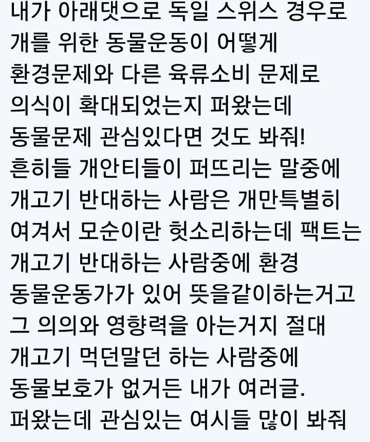 개고기 왜 반대하냔 사람중에 찐으로 비건하며 소돼지 문제 발벗고 나서서 싸우는 사람 없는데 개고기 반대자들 안에 저렇게 싸우는 환경운동가들 다 있음ㅇㅇ