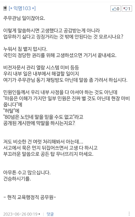 작성자오마이갓더 작성시간 23.06.27 자영업자, 서비스직들 푸념글에는 왜 뒤에서 글 쓰냐는둥 이런 반응 많이 못 본 것 같은데 솔직히 매번 공무원한테는 박하단 생각 든다ㅠㅠ....어쨋든 해준 것도 맞고 뒤에서 이정도 힘듦은 토로할 수 있다 생각하는데...