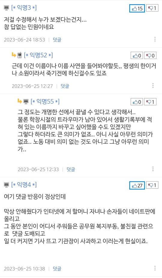 개명을 했으니 생활기록부 정정을 하고 싶다는 1940년대생 할머니. 돌아가시기 전에 이름을 꼭 바꾸고 싶었다고.
