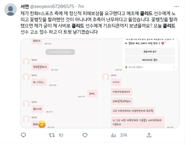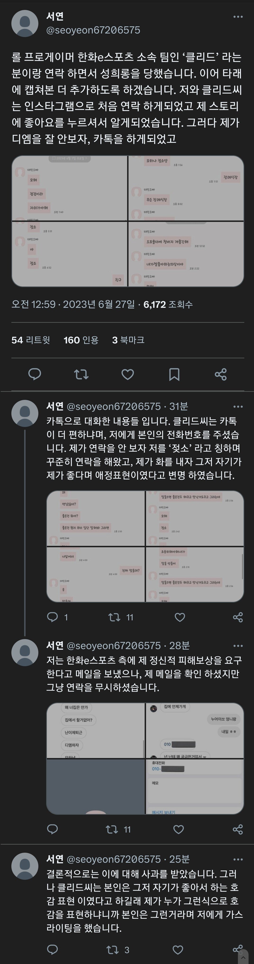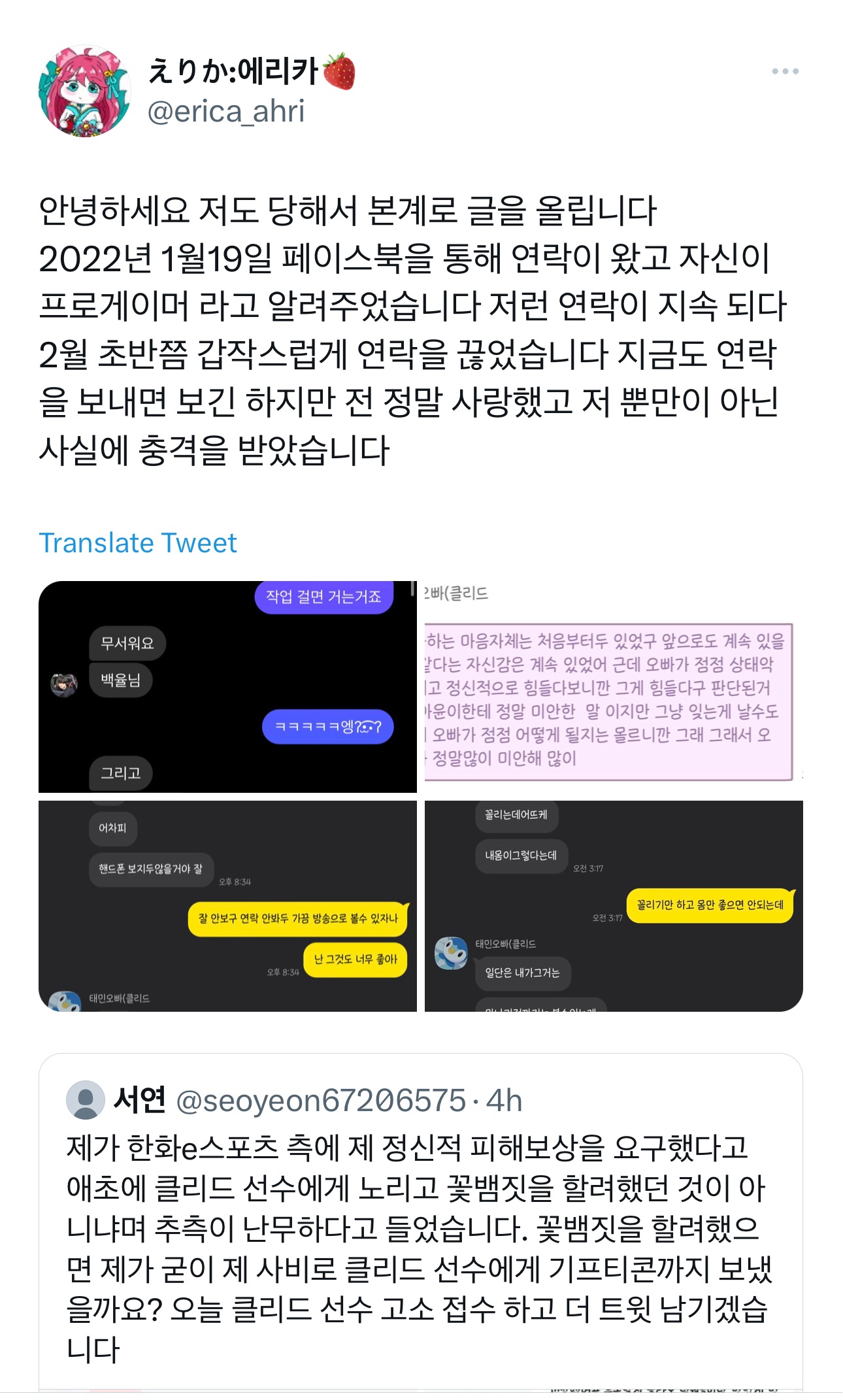 [기타]현재 롤판에서 난리난 한화소속 클리드 성희롱 폭로사 작성자(본인|작성시간23.06.27|조회수36,770 목록 댓글 270 글자크기 작게가 글자크기 크게가 출처 : 여성시대 (본인 + 피해자 한명 더 나옴, 미성년자https://twitter.com/erica_ahri/status/1673534722729984000?s=46&t=Sf_KZbLbzT6GshQAK924Nw트위터에서 즐기는 えりか:에리카🍓“안녕하세요 저도 당해서 본계로 글을 올립니다 2022년 1월19일 페이스북을 통해 연락이 왔고 자신이 프로게이머 라고 알려주었습니다 저런 연락이 지속 되다 2월 초반쯤 갑작스럽게 연락을 끊twitter.com 다음검색 현재 게시글 추가 기능 열기 북마크 공유하기 신고 센터로 신고 댓글 댓글 270 댓글쓰기 답글쓰기 댓글 리스트 작성자발시개 | 작성시간 23.06.28 미챳다 작성자유어마이삼색 | 작성시간 23.06.28 무슨자신감이냐고 하기엔 여자들한테 인기가 있다고 하니 참 할말이 없어짐... 작성자nsdd | 작성시간 23.06.28 토나와 작성자그물망 | 작성시간 23.06.28 놀랍지도 않다 어휴 역겨워 작성자명상이세상을구한다 | 작성시간 23.07.02 헐.................대충격 댓글 전체보기