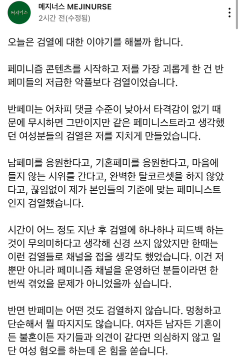 답댓글 작성자제니퍼로렌스 작성자 본인 여부 작성자 작성시간 23.06.30 쩝.. 나는 기혼여성과 연애하는 여성 죽어라 패는거 보고 신물나서 끌올한 거긴 함ㅎ 고민글 굳이 퍼와서 굳이 욕하고.. 요즘은 남자글에도 굳이 여자 찾아서 패던데.. 아 물론 나는 연애도 안하고 결혼도 안하고 애도 없고 탈코 한지도 7년이 넘었내요 ㅋ