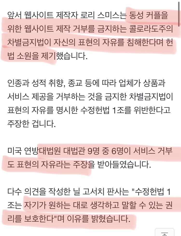 [여시뉴스데스크]미국 대법원 "동성 커플에 서비스 거부 가능" 작성자(본인닉네임).|작성시간23.07.02|조회수2,875 목록 댓글 12 글자크기 작게가 글자크기 크게가 출처 : https://n.news.naver.com/article/214/0001282935?sid=104 강나림(allin@mbc.co.kr) 다음검색 현재 게시글 추가 기능 열기 북마크 공유하기 신고 센터로 신고 댓글 댓글 12 댓글쓰기 답글쓰기 댓글 리스트 작성자존시나까잡솨 | 작성시간 23.07.02 트젠인척해야겠네 작성자다쿠스쿠 | 작성시간 23.07.02 트젠 이성애 커플이라고 우기면 해줄듯? 참 웃기는 사상이야 작성자불로소득으로살게헤주세요 | 작성시간 23.07.02 엥 개도라이들인가 작성자불로소득으로살게헤주세요 | 작성시간 23.07.02 수술도 안한 남트젠 여성사우나 들어가는거 막는건 차별이라고 해놓고 동성애자라고 거절하는건 차별 아니고 자유임? 별 작성자Miguel Ohara | 작성시간 23.07.02 왜 역행하냐 댓글 전체보기