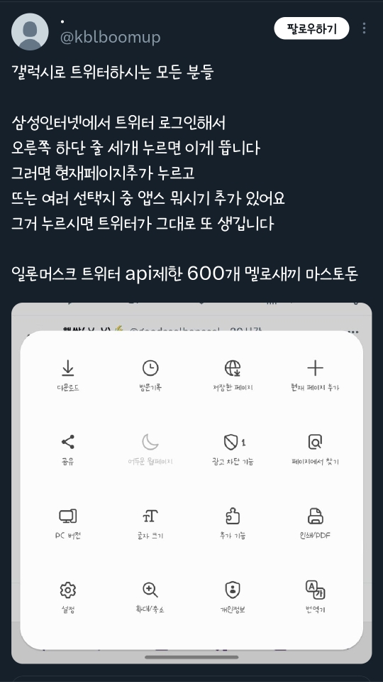 작성자sqh0707 작성시간 23.07.03 아이폰도 사파리로 들어가서 홈화면추가하니까 앱트위터랑 비슷한 환경 구축되긴하더라...ㅎㅎ 아니 그냥 트위터를 빨리 고치라고ㅜㅜㅜㅜㅜㅜㅜ