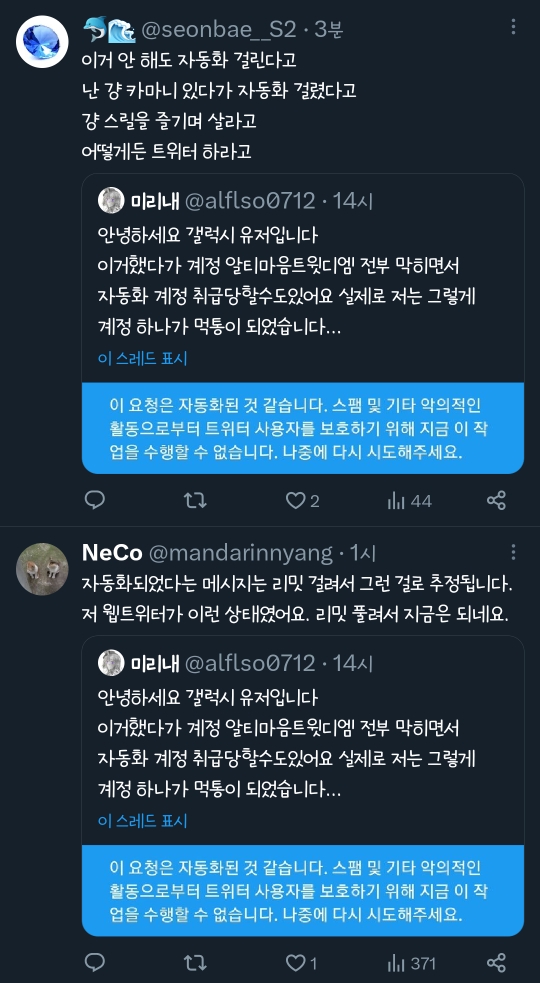 답댓글 작성자지긋지긋 작성자 본인 여부 작성자 작성시간 23.07.03 아니 되는데 자동화되는건 걍 트위터문제라는거....