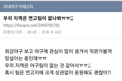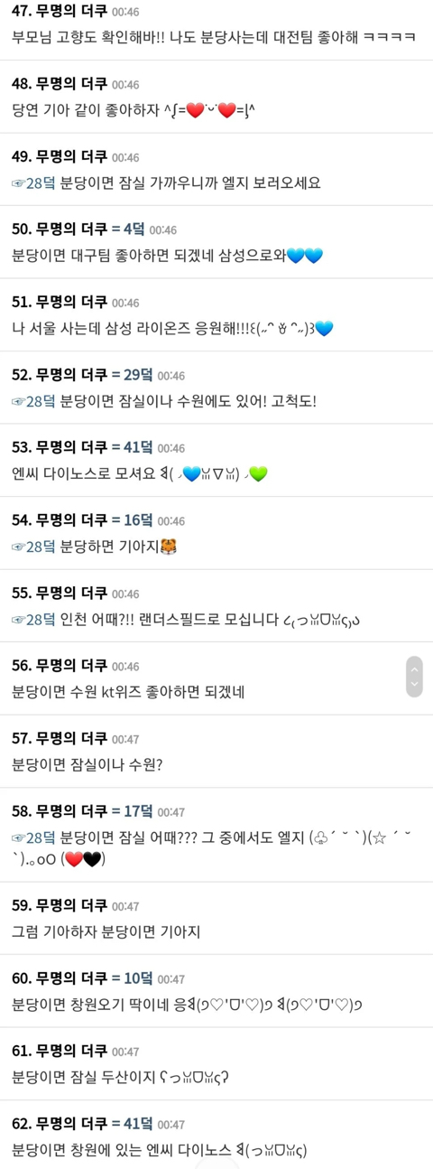 작성자으어악악닥 작성시간 23.07.08 근데진짜 입덕은 가슴이 시키는 거더라.. 나 고향에도팀있고 지금 사는 지역에도 팀있는데 진짜 뜬금없이 입덕함 ㅋㅋㅋㅋ.. 잘하는팀이면 말을 안해...ㅎㅎ 그래도 맘이 가는데 어째..