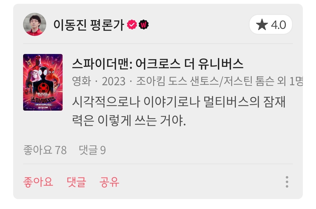 작성자겨울의조각 작성시간 23.07.11 중간에 조금 루즈한 부분 있었지만 오프닝 부분 스파이더 소사이어티랑 추격전 그리고 엔딩 부분 스토리들 대체로 좋았고 시각적 연출 너무 좋았어 존잼