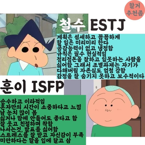 [흥미돋]짱구 등장인물로 보는 mbti 유형 작성자노루밤비|작성시간23.07.11|조회수5,477 목록 댓글 21 글자크기 작게가 글자크기 크게가 출처 : 여성시대 노루밤비 다음검색 현재 게시글 추가 기능 열기 북마크 공유하기 신고 센터로 신고 댓글 댓글 21 댓글쓰기 답글쓰기 댓글 리스트 작성자내일 일찍 일어나야 되는 사람 | 작성시간 23.07.11 엔프피도 껴줘요ㅠㅠㅠㅠㅠ 작성자맴맙 | 작성시간 23.07.11 아,,,차은주.. 작성자닮은상근 | 작성시간 23.07.11 ENFP는 액션가면 아닐까?!자기 일 뒤로하고 일단 남부터 구하러 가는 정의의 사도,, 작성자장래희망베짱이 | 작성시간 23.07.11 훈발놈...ㅠ 작성자아갓쉬 | 작성시간 23.07.11 아앀ㅋㅋㅋㅋㅋㅋㅋㅋㅋㅋㅋㅋㅋㅋ 댓글 전체보기