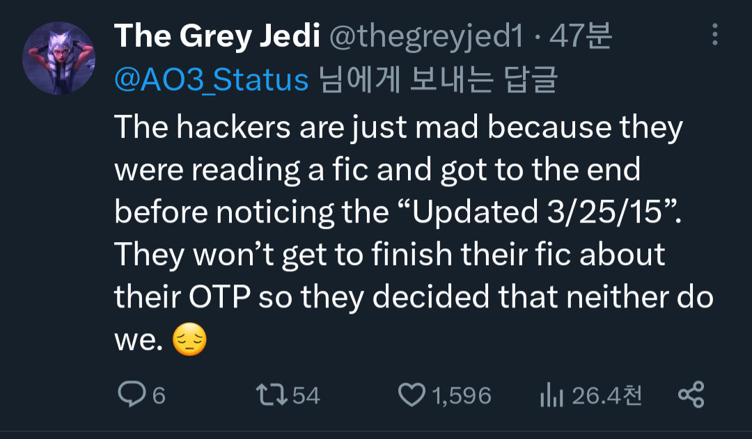 해커들은 걍 "2015년 3월 25일 마지막 업데이트 됨" 확인 못하고 팬픽 읽어서 빡친거임. 지네 최애컾 완결 못봐서 우리도 못보게 만든거지.😞