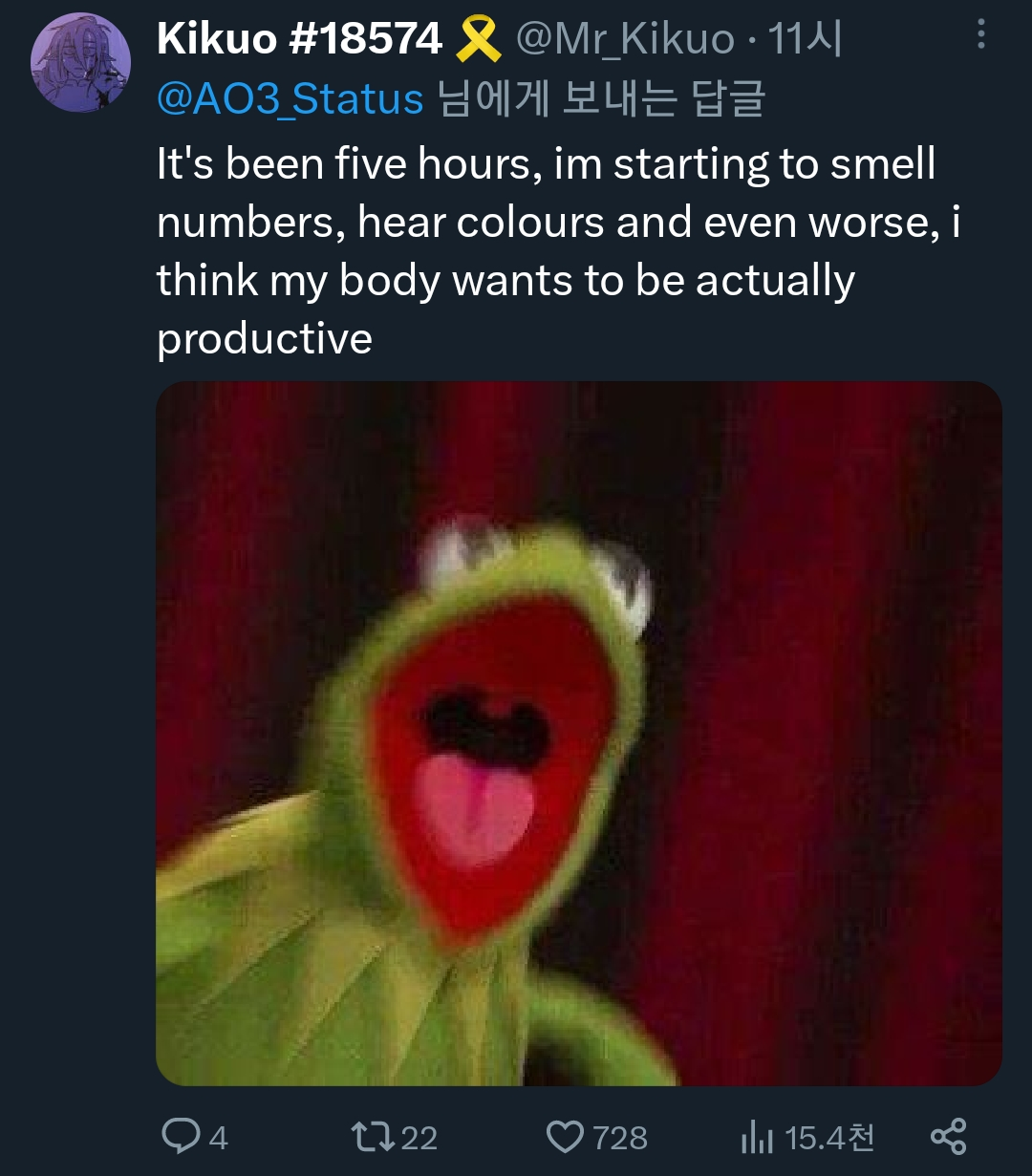 다섯시간 째야, 나 이제 숫자를 냄새 맡을 수 있고, 색이 들리고 더 나쁜건 내 몸이 ㄹㅇ로 생산적인걸 하고 싶어하는 것 같아