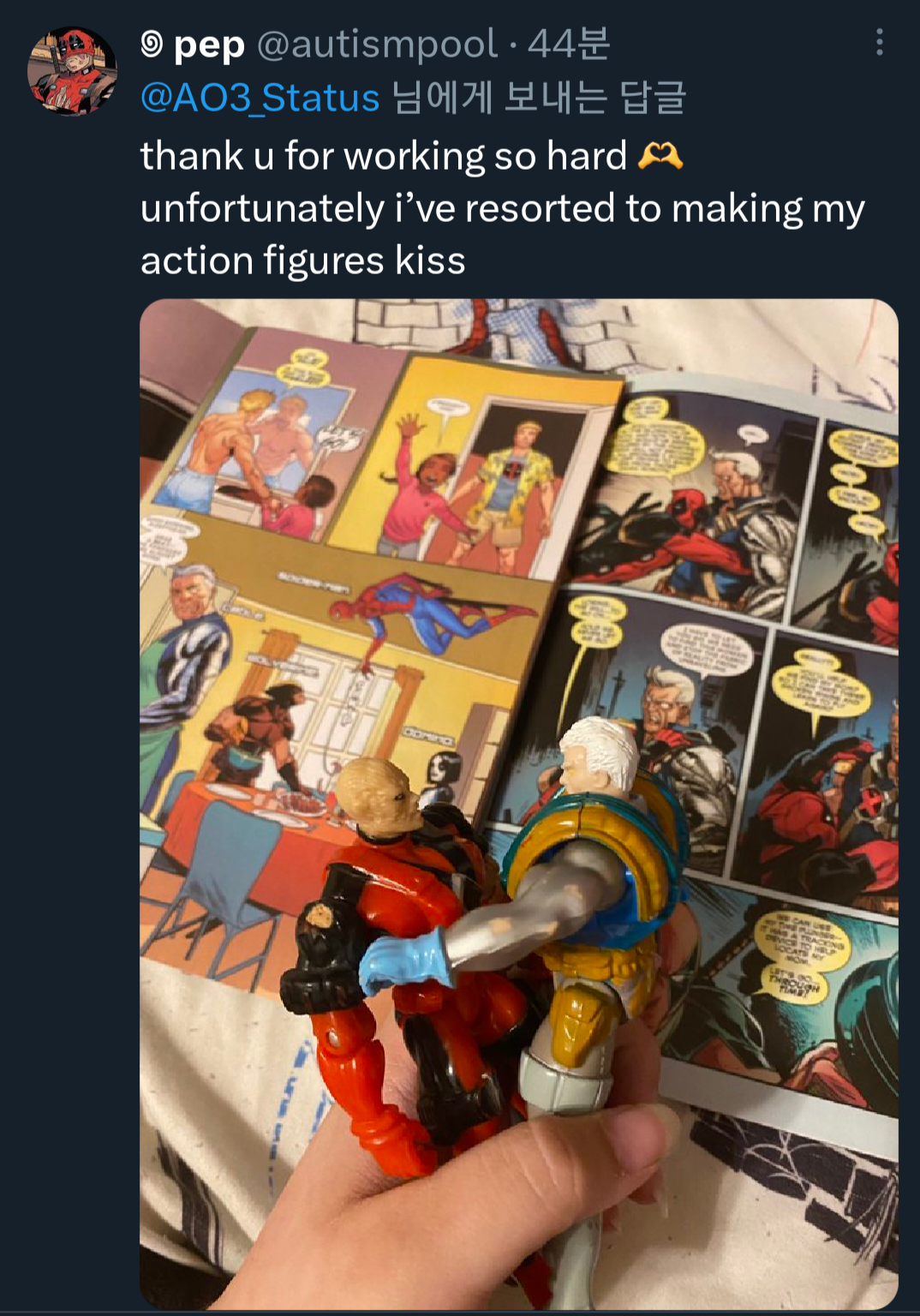 열일해줘서 넘 ㄳ🫶♡ 안타깝게도 나는 내 액션피규어끼리 키스하는 걸로 대신하게 됐어... (데드풀이랑 케이블인듯?)