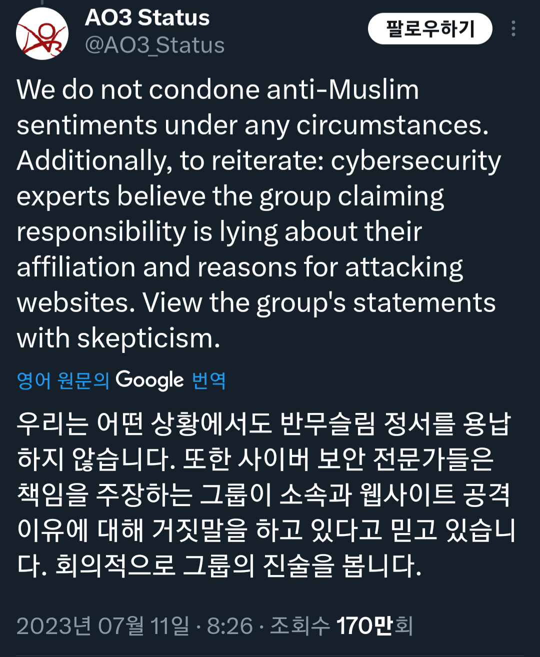 아오삼은 그런 주장이 있다는건 알고 (인터넷에 캡쳐가 돌아다님) 있는데 그렇다고 해서 이게 특정 종교 비난하는 쪽으로 가면 안된다는 입장임. 사이버보안 전문가들은 그 단체가 주장하는 아오삼을 공격한 이유가 거짓말이라고 생각하고 있다고 함. 그러니까 그 단체의 주장도 회의적으로 생각해달라고.