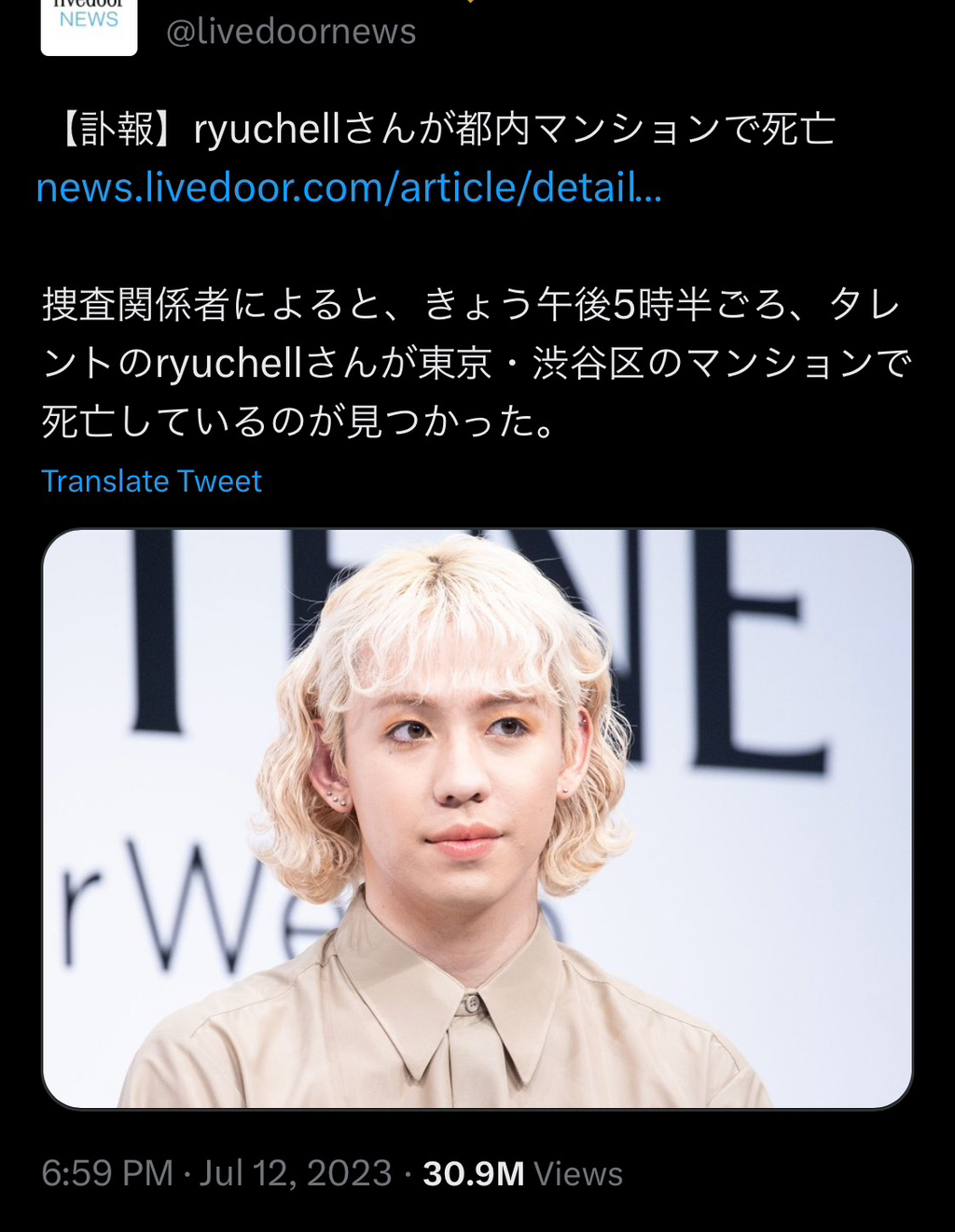 [여시뉴스데스크]일본탤런트 ryuchell 사망 작성자패브릭키친|작성시간23.07.12|조회수18,586 목록 댓글 67 글자크기 작게가 글자크기 크게가 출처 : 여성시대 패브릭키친https://twitter.com/livedoornews/status/1679067931584626688?s=20트위터에서 즐기는 ライブドアニュース“【訃報】ryuchellさんが都内マンションで死亡 https://t.co/DTgvlTg1Xx 捜査関係者によると、きょう午後5時半ごろ、タレントのryuchellさんが東京・渋谷区のマンションで死亡しているのが見つかっtwitter.com자살 추정이고얼마 전에 커밍아웃했음(아내랑 아들 있어) 다음검색 현재 게시글 추가 기능 열기 북마크 공유하기 신고 센터로 신고 댓글 댓글 67 댓글쓰기 답글쓰기 댓글 리스트 작성자남냠냠 | 작성시간 23.07.13 할부 많이 남은 으리으리한 집이라도 남기고 갔겠지?? 답댓글 작성자내가최고임아무튼 | 작성시간 23.07.13 페코가 유명패션모델이였고 원랱부잣집딸(? 답댓글 작성자남냠냠 | 작성시간 23.07.14 엥 그런 사람이 왜… 작성자영화처돌이 | 작성시간 23.07.13 엥???? 작성자동구라미라미 | 작성시간 23.07.13 신기할정도로 이기적인 선택만 한 삶이네.... 댓글 전체보기